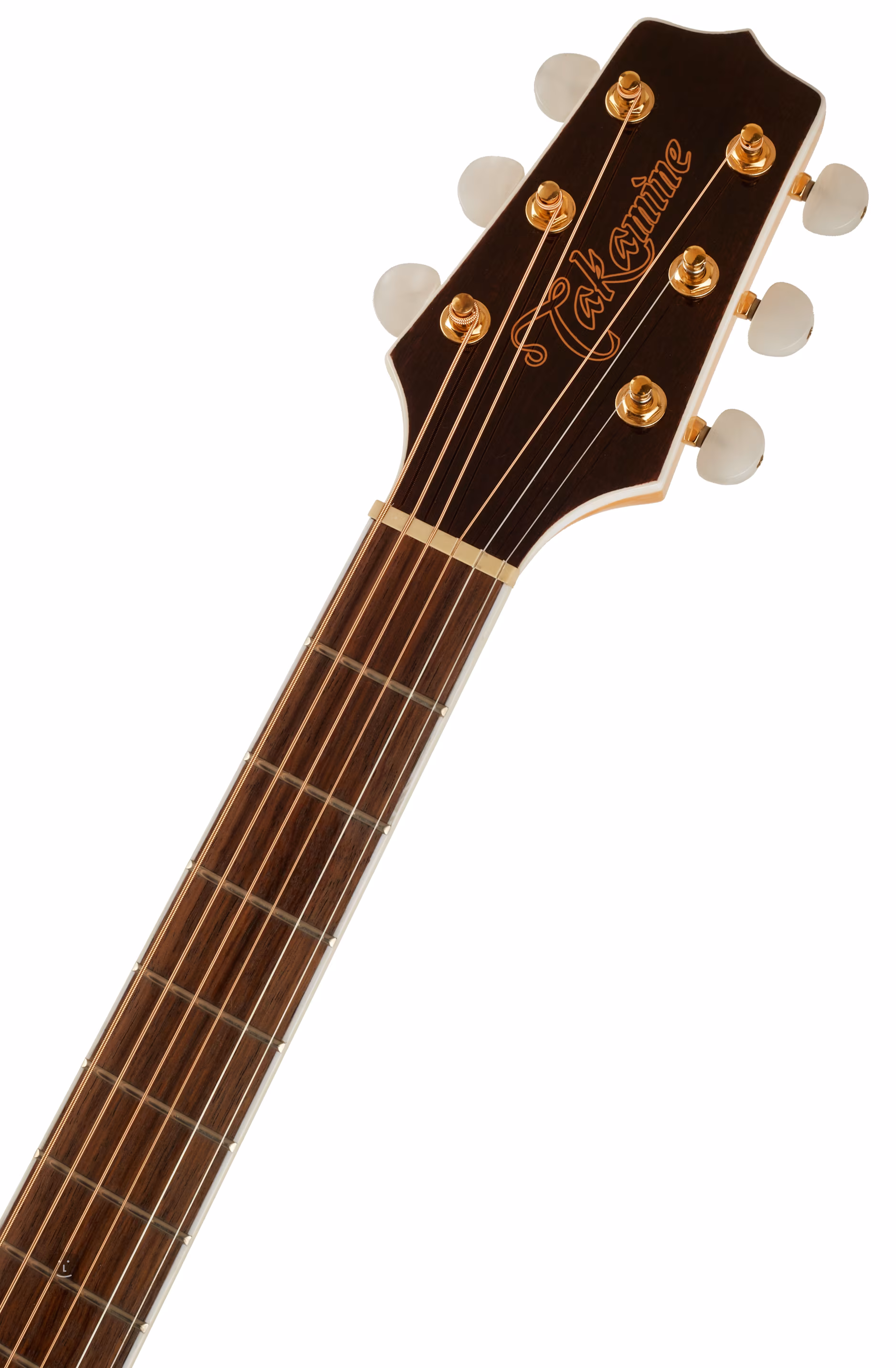 Die Saiten werden in Druckguss-Stimmmechaniken über synthetischen Knochenbünden und Sätteln in luxuriösem Gold-Finish mit Perlmutt-Wirbeln und einem Feigenholz-Griffbrett gehalten. Split Saddle, ein geteilter kompensierter Sattelbund, verleiht der Gitarre eine präzise Intonation. Der stilvolle Look der Gitarre wird durch praktische und dekorative Elemente in Form eines Schlagbretts aus Schildpattimitat, Perlmuttrosetten (Abalone), dekorativen Perlmuttintarsien am zwölften Bund (Abalone) und dem Firmenlogo auf der Kopfplatte unterstrichen.