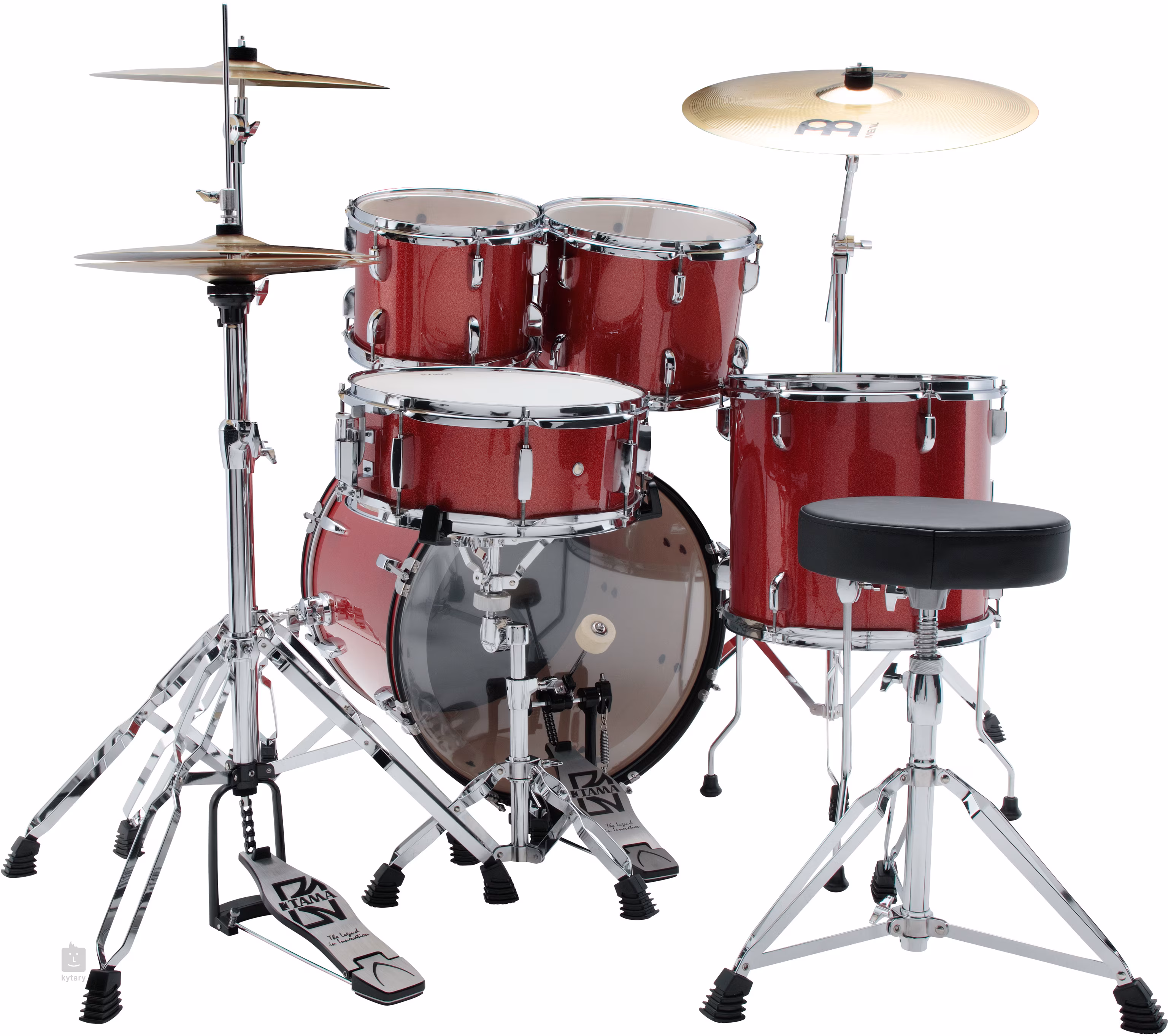 Zum Tama ST50H6 gehört auch eine komplette Hardware-Ausstattung mit doppelt verstärkten Ständern, die auch bei energischem Spiel für hohe Stabilität sorgen. Das Drum-Pedal verfügt über einen doppelten Kettenantrieb und eine einstellbare Beater-Neigung, wodurch die Reaktion je nach Spielstil fein abgestimmt werden kann. Das Paket wird durch ein Meinl Cymbals BCS-Beckenset ergänzt, das ein 20'' Ride, ein 16'' Crash und ein 14'' Hi-Hat enthält.