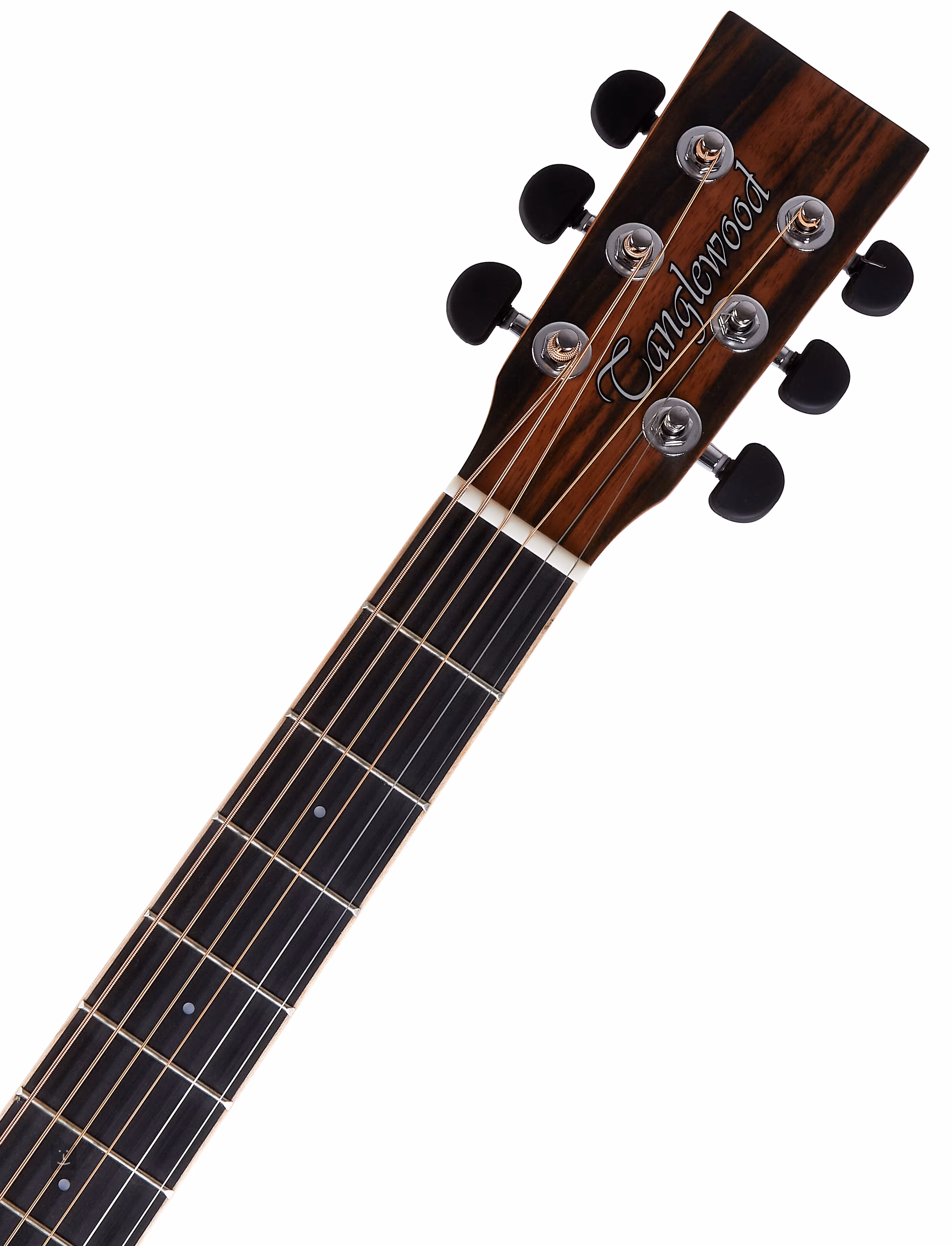 Die Tanglewood Discovery DBT SFCE AEB ist eine elektroakustische Gitarre vom Typ "Super Folk", d.h. ein Instrument mit einem schmaleren und flacheren Korpus als z.B. die Dreadnought. Der mehrschichtige Korpus der Gitarre ist aus Ebenholz gefertigt, dessen Maserung dem Instrument das luxuriöse Aussehen verleiht, das man von wesentlich teureren Modellen erwarten würde. Der Hals ist am vierzehnten Bund mit dem Korpus verbunden, und die Oberfläche des aus Ebenholz gefertigten Griffbretts ist durch zwanzig Bünde und Orientierungspunkte unterteilt. Ein unterer Korpusausschnitt erleichtert den Anschlag in den höheren Lagen des Griffbretts.
