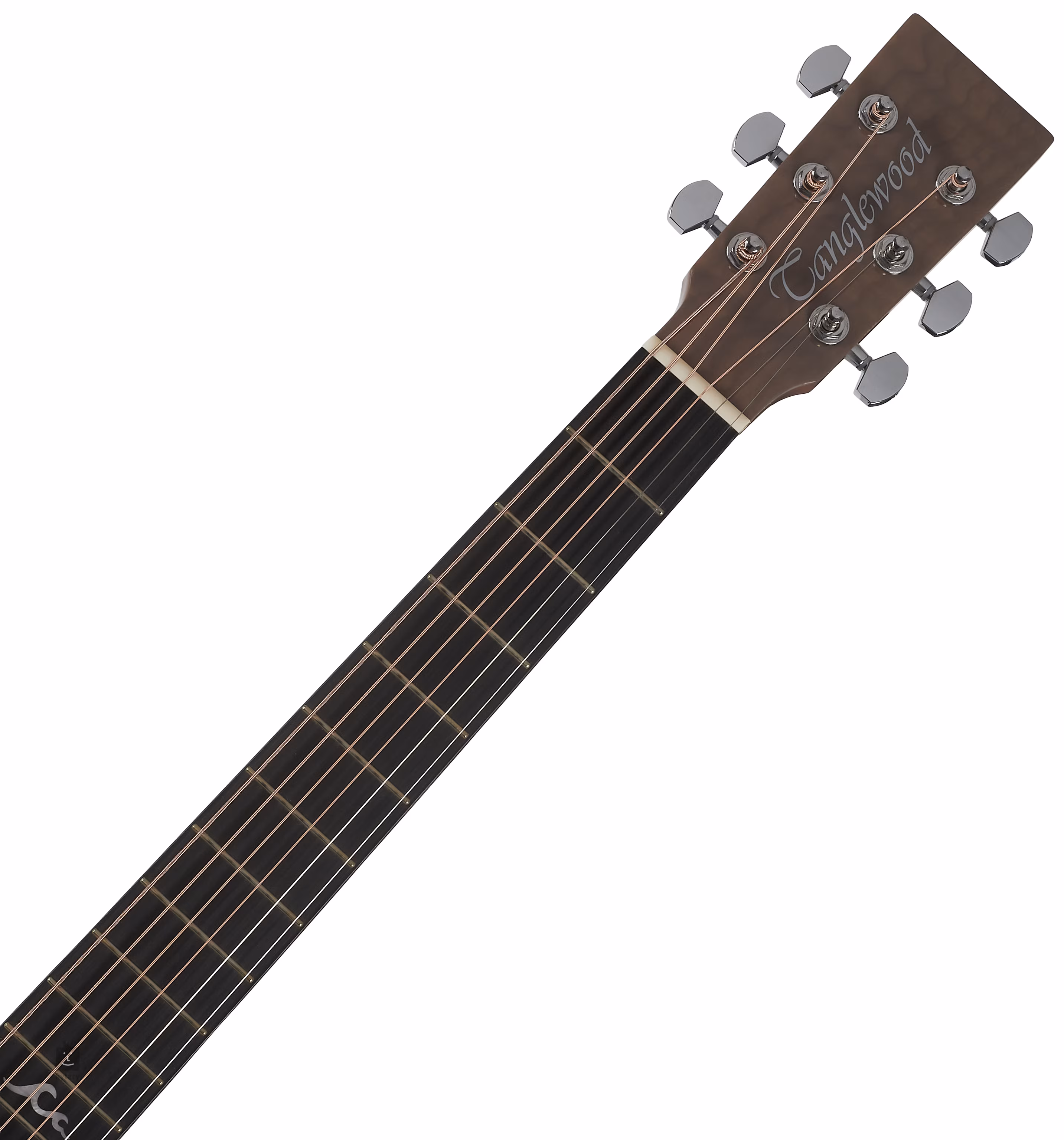 Die Tanglewood TA4CE GY ist eine elektroakustische Gitarre mit einem modernen „Super Folk”-Korpus, der im Vergleich zu Dreadnought-Modellen schmaler und flacher ist. Die Decke der Gitarre besteht aus geschichtetem nordamerikanischem Schwarznussholz, der Boden und die Zargen sind aus geschichtetem Ahorn gefertigt. Die luxuriöse Maserung des Nussbaums wird durch die glänzende Harbour Grey Gloss-Lackierung hervorgehoben.