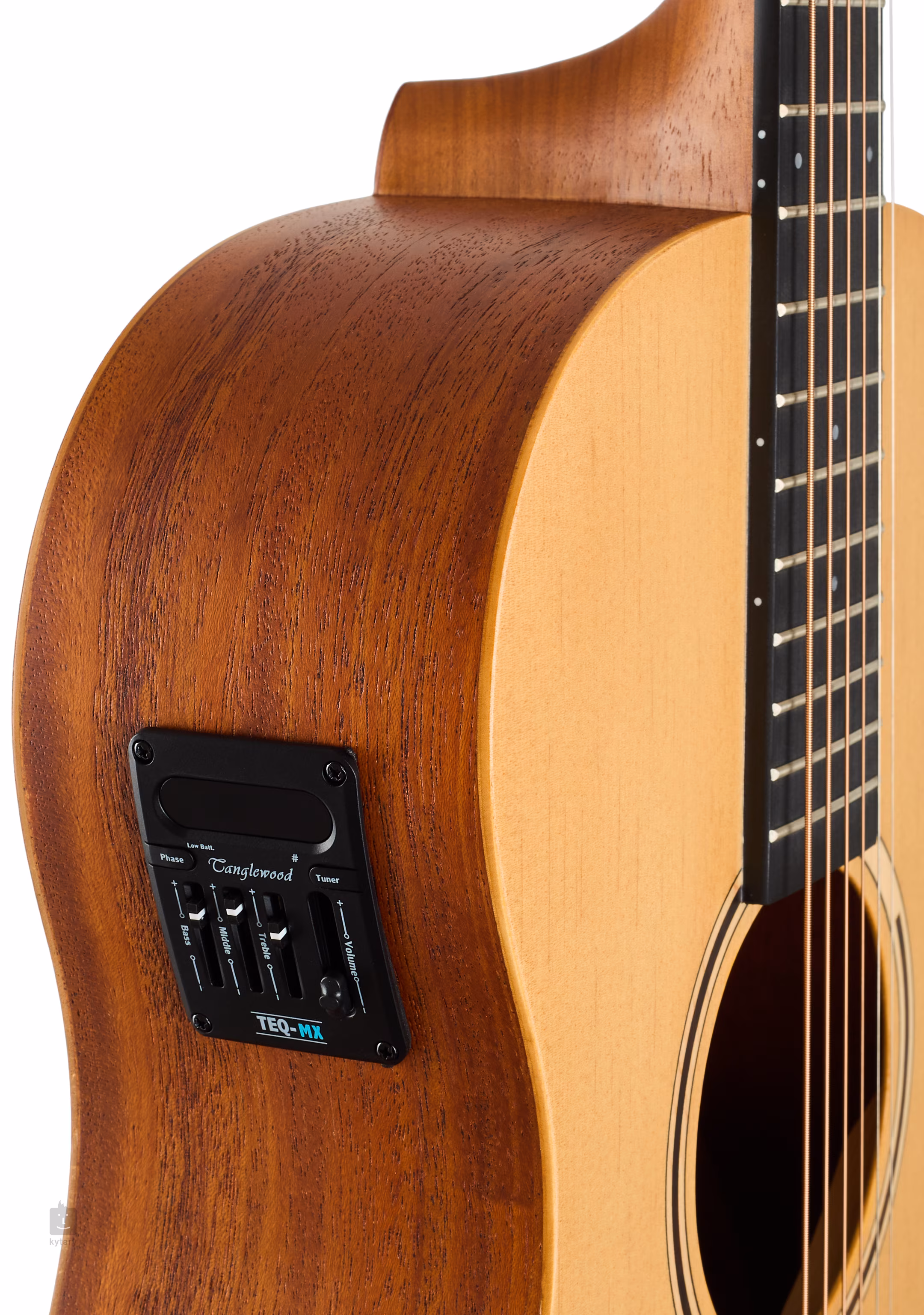 Die Tanglewood Roadster II TR8 E ist eine elektro-akustische Gitarre mit einer kompakten Parlor-Korpusform. Die Vorderseite der Gitarre besteht aus laminierter kanadischer Fichte, während der Boden und die Zargen aus Sperrholz und indonesischem Mahagoni gefertigt sind. Der Hals ist am zwölften Bund mit dem Korpus verbunden, und die Oberfläche des aus Ebenholz gefertigten Griffbretts ist durch zwanzig Bünde und Landmark-Positionspunkte unterteilt.