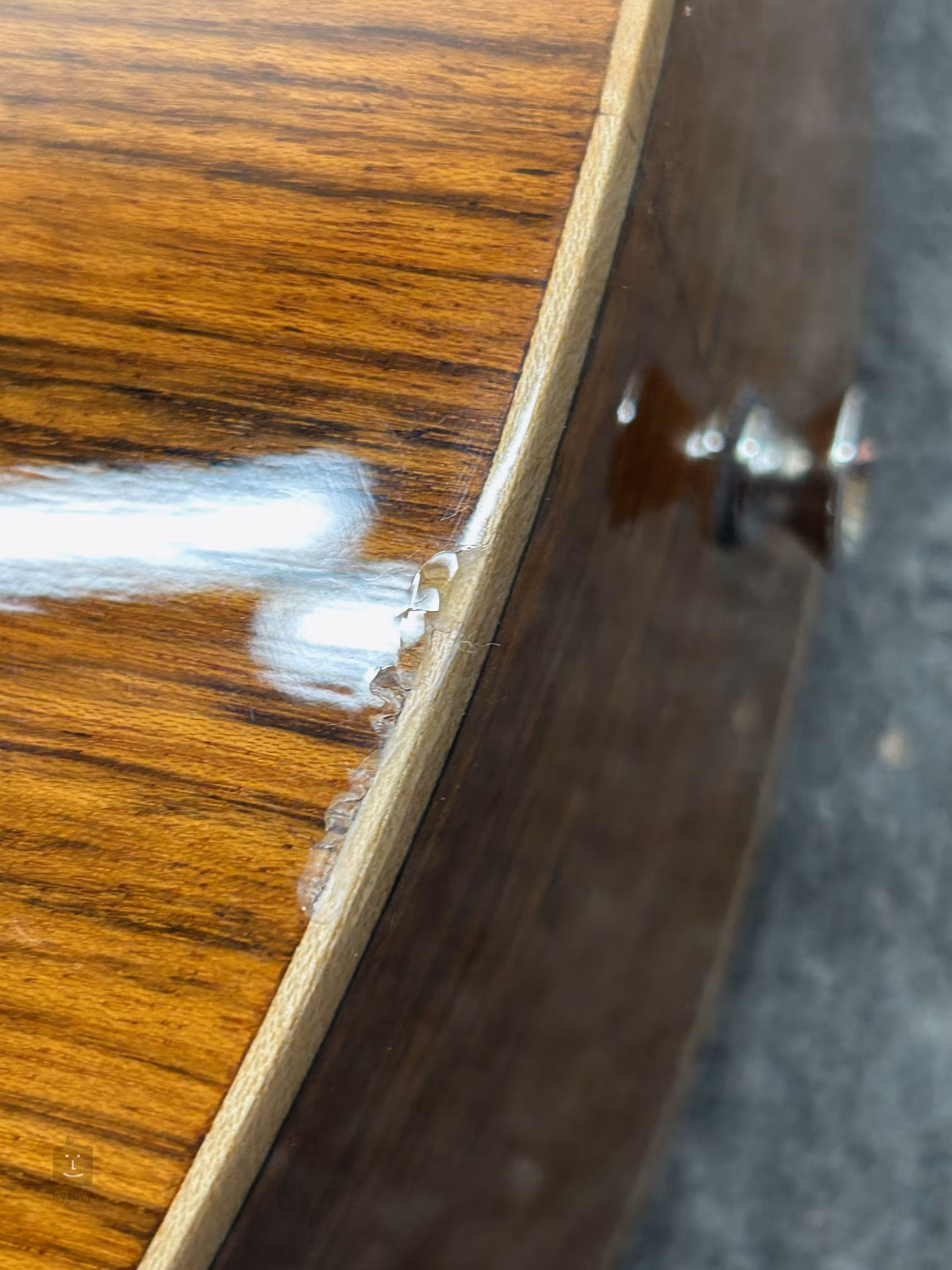 Beschädigter Lack an der Kante des Korpus und der Bodenplatte (siehe Foto). Die Ware weist geringfügige Gebrauchsspuren auf, die durch das Ausprobieren oder die kurzfristige Ausstellung der Ware im Laden entstanden sind (siehe Foto).
