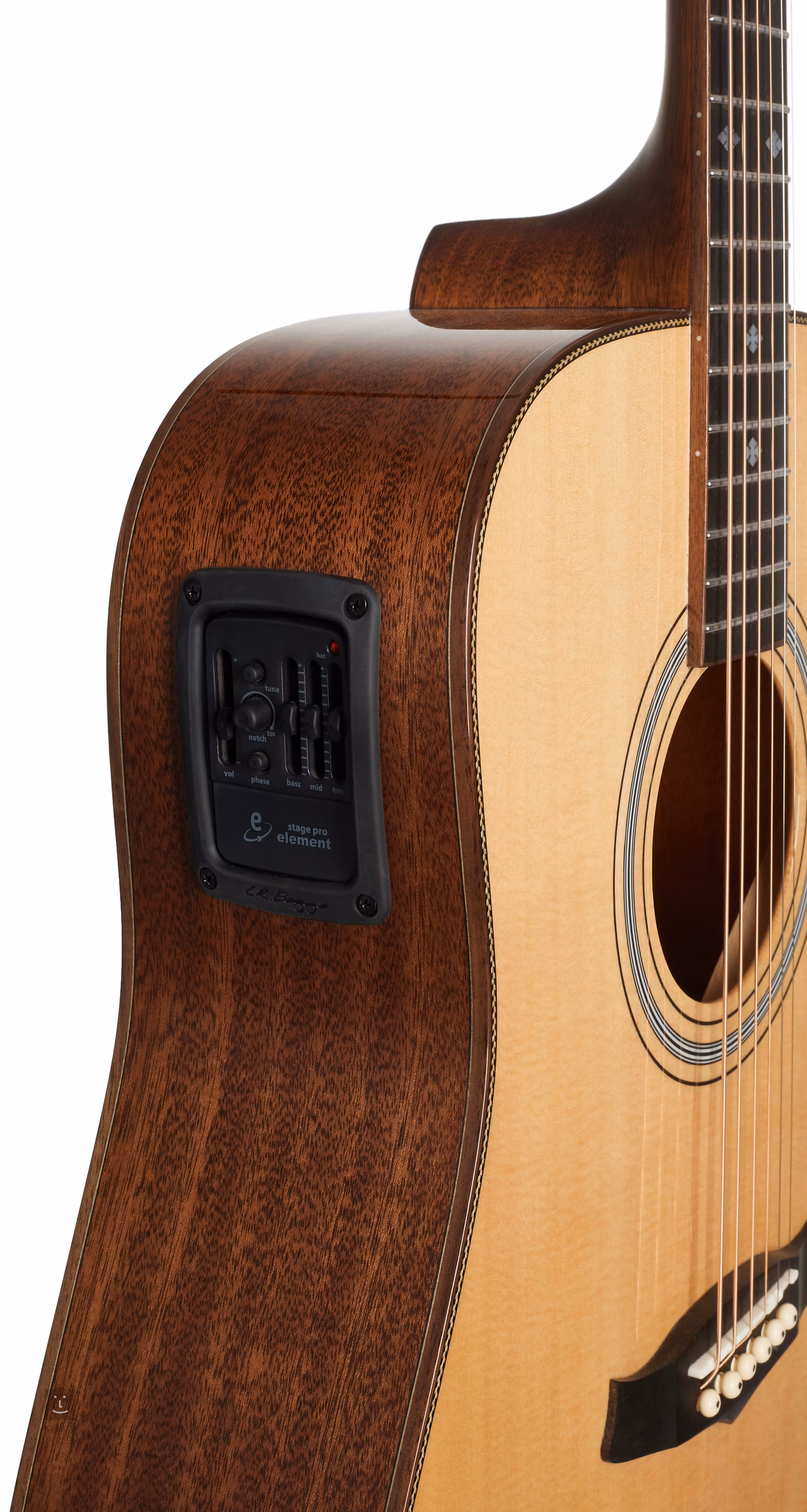 Für den Sound sorgt die Fishman Presys Blend-Elektronik mit Dreiband-Equalizer und eingebautem Stimmgerät. Die Saiten werden in Stimmmechaniken (Gold Waverly) und einem Ebenholzgriffbrett über ein Knochengriffbrett und einen Sattel gehalten. Die schöne Verarbeitung wird durch die glänzend lackierte Decke, die goldene Hardware und das Perlmutt-Firmenlogo auf der Kopfplatte unterstrichen.
