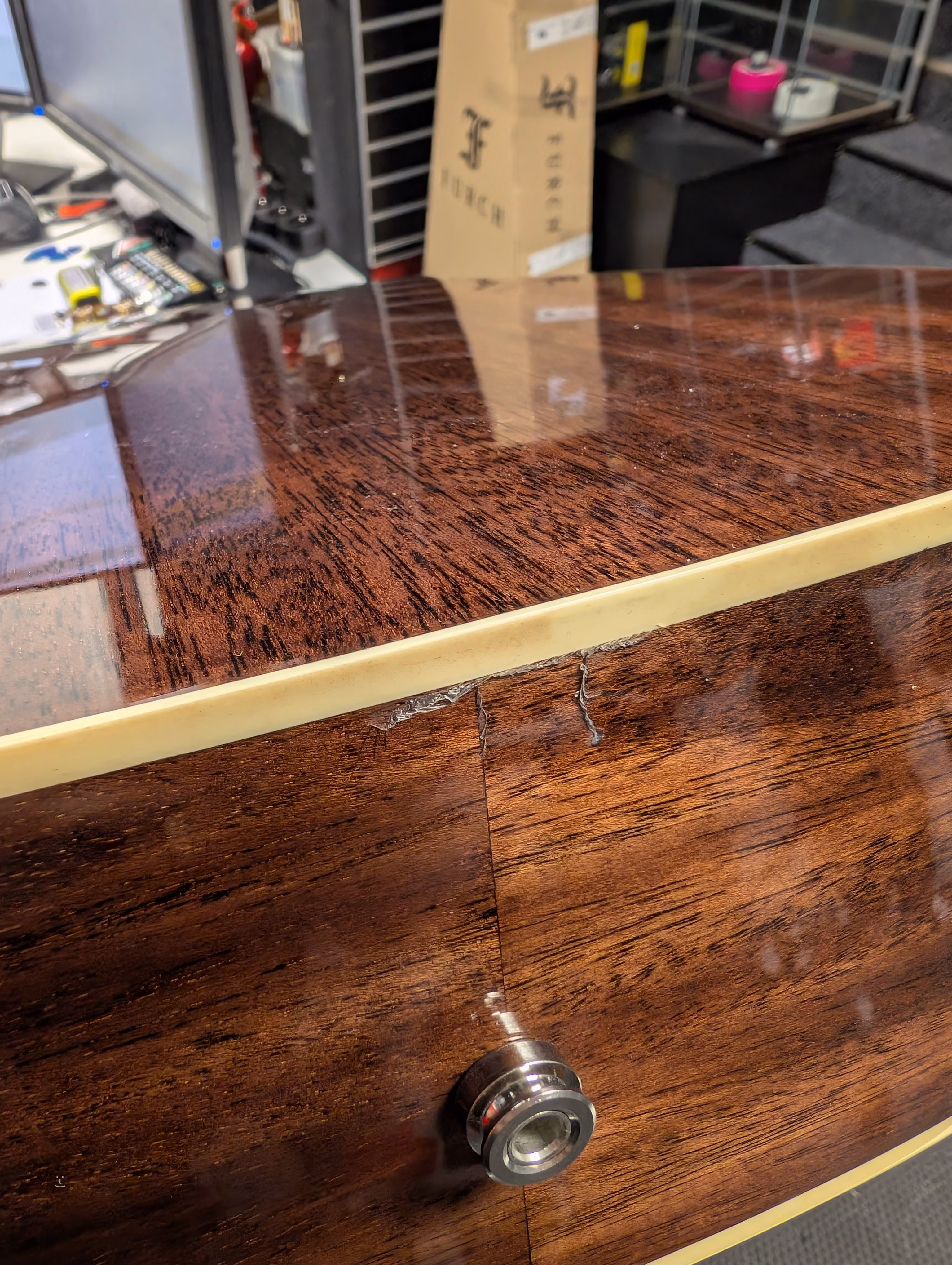 Die Gitarre ist an der Unterseite des Korpus leicht abgerieben (siehe Foto). Ansonsten ist die Ware völlig in Ordnung und funktionsfähig. Die britische Marke Tanglewood bietet preisgünstige Akustikgitarren in Retro- und modernen Designs. Die TW40 SD VS E ist eine elektroakustische Gitarre vom Typ Dreadnought Slope Shoulder mit einer halbmassiven Korpuskonstruktion. Die massive Fichtendecke des Instruments wird durch Mahagoni-Sperrholz an den Zargen und der Rückseite ergänzt. Das Griffbrett aus Feigenholz ist durch zwanzig Bünde und weiße Positionspunkte unterteilt. Die Beschallung erfolgt über Fishman Sonitone-Elektronik mit Reglern, die dezent in die Schalllochöffnung der Gitarre eingelassen sind. Die Saiten sind in verchromten Stimmmechaniken und einem Walnuss-Steg befestigt. Die schöne Verarbeitung wird durch eine helle Einfassung, die Farbgebung der Decke in Vintage Sunburst Gloss und ein praktisches Schlagbrett unterstrichen, das den glänzenden Lack des Instruments vor Kratzern schützt. Die Gitarre wird in einem Koffer geliefert.