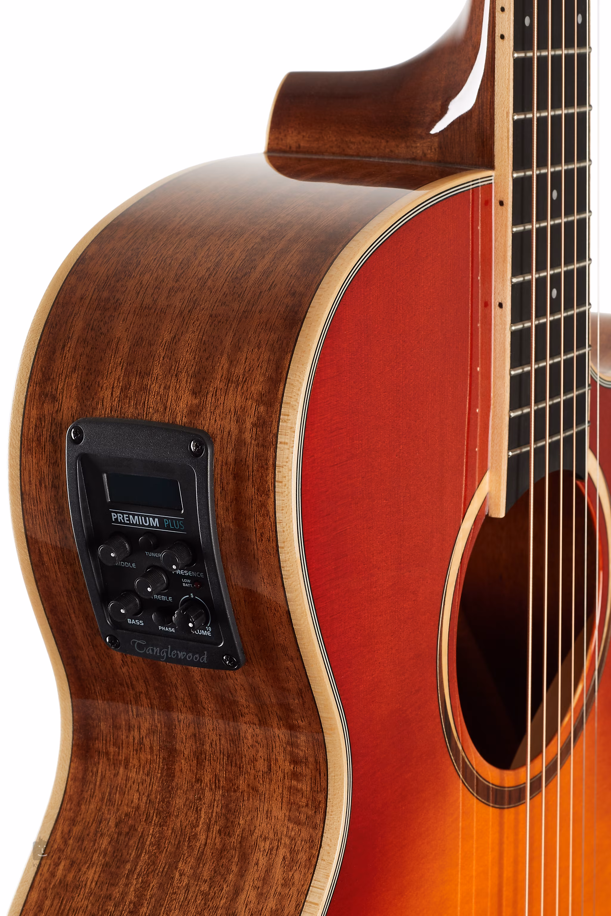 Zur Klangverstärkung gibt es den TW Premium Plus Vorverstärker mit Vierband-EQ, Phasenfunktion und integriertem Stimmgerät. Die Saiten werden in einer verchromten Druckgussmechanik und einer Composite-Kopfplatte über NuBone-Null- und Sattelbünde gehalten. Die schöne Verarbeitung wird durch das doppelseitige Ahorn-Binding am Korpus, Mother of Pearl-Positionspunkte auf dem Griffbrett, einen Mittelstreifen auf der Bodenplatte und ein glänzendes Cherry Sunburst Gloss-Finish auf der Frontplatte unterstrichen.