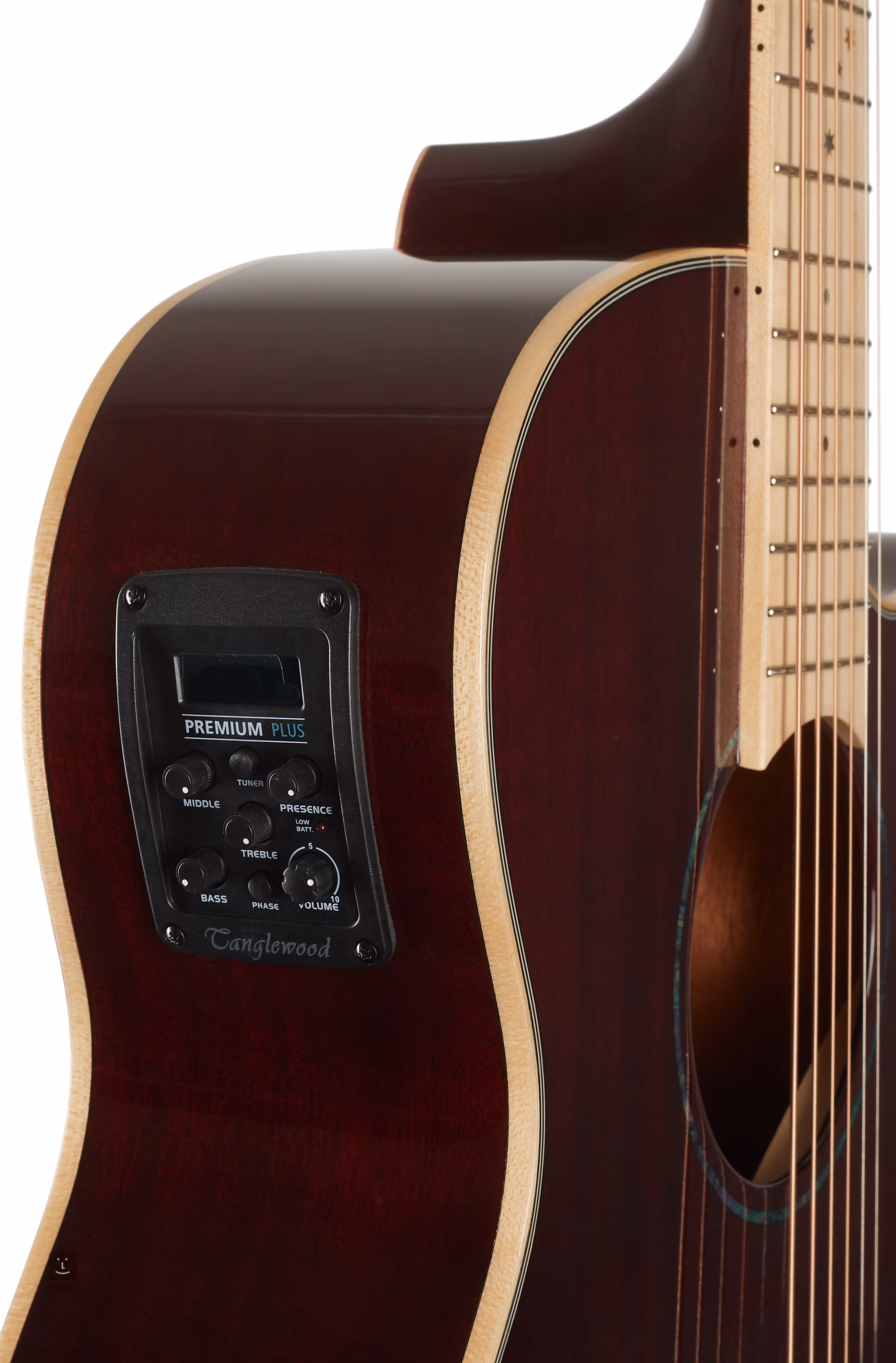 Zu den Klangverstärkungsoptionen gehört der TW Premium Plus Vorverstärker des Unternehmens mit Vierband-EQ, Phasenfunktion und eingebautem Stimmgerät. Die Saiten werden in Grover-Chromdruckguss-Mechaniken und einer Composite-Kopfplatte über NuBone-Null- und Sattelbünde gehalten. Die schöne Verarbeitung wird durch das Ahorn-Binding, die Abalone-Rosette, den Mittelstreifen auf der Bodenplatte, die Perlmutt-Positionspunkte und die Barossa Red Gloss-Lackierung unterstrichen.