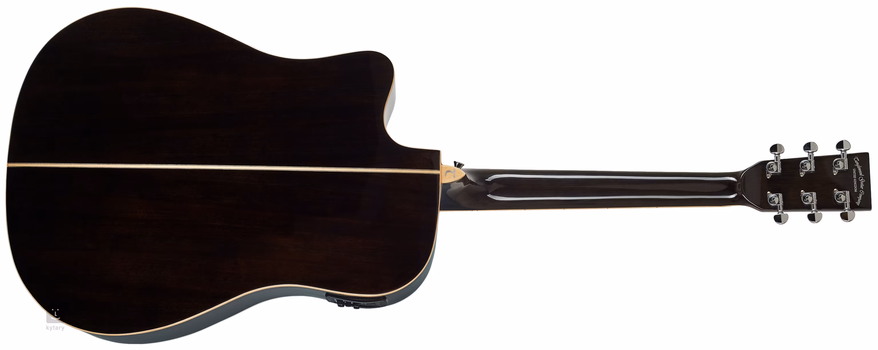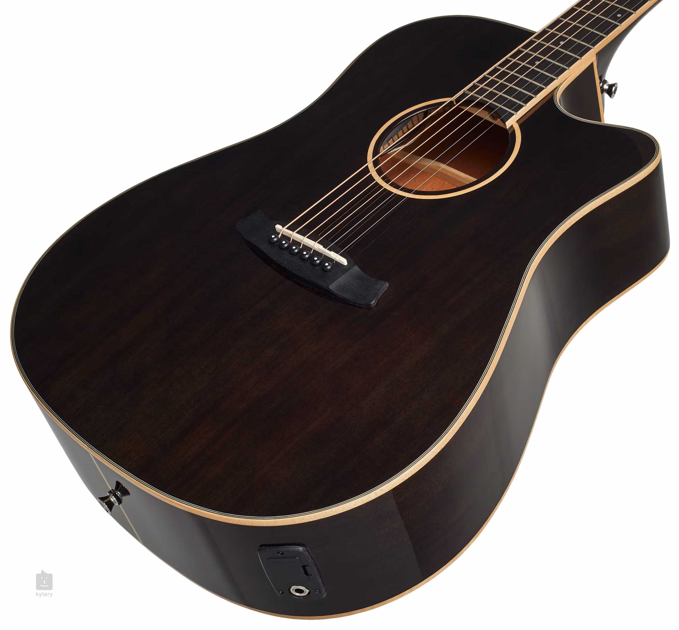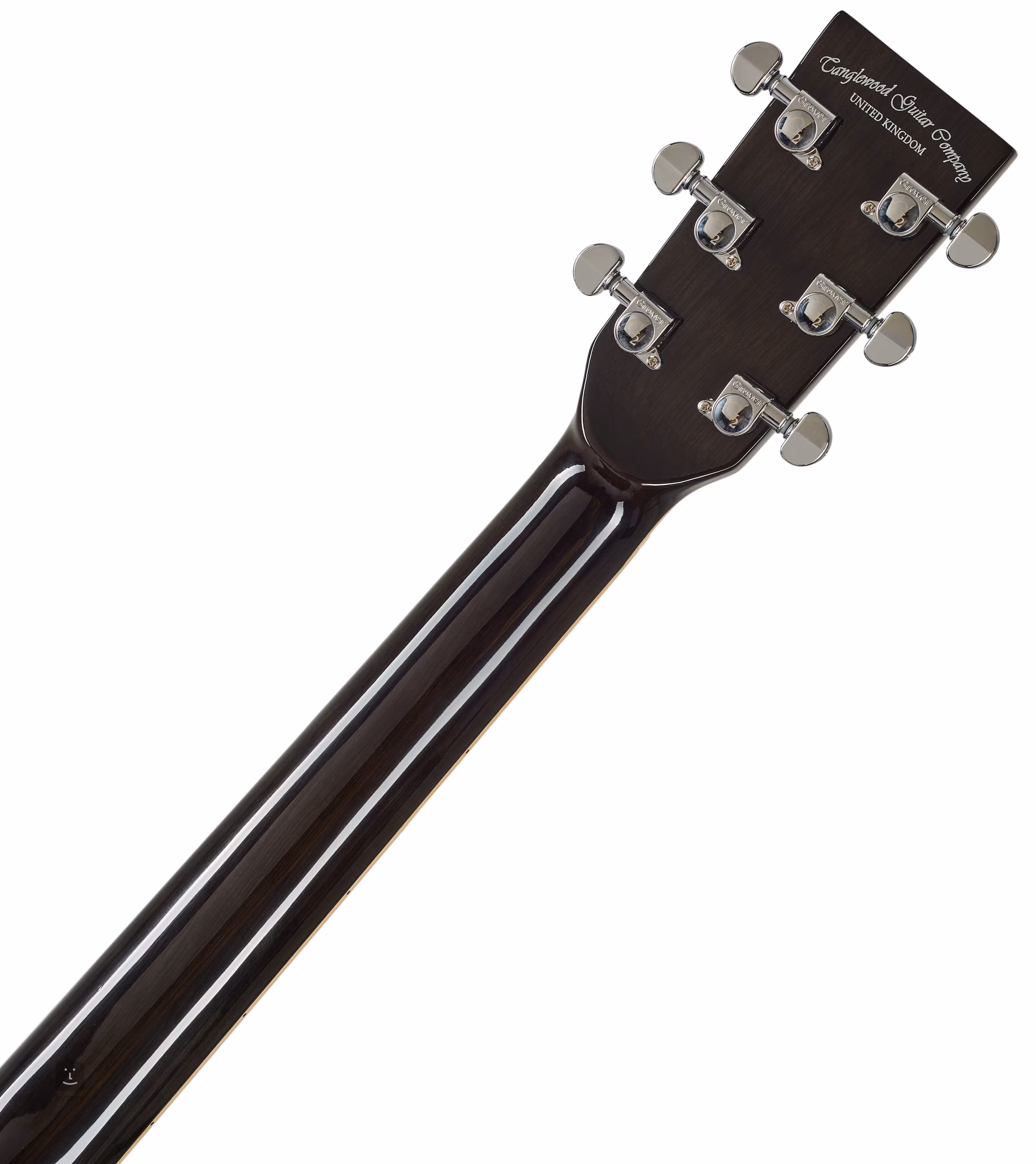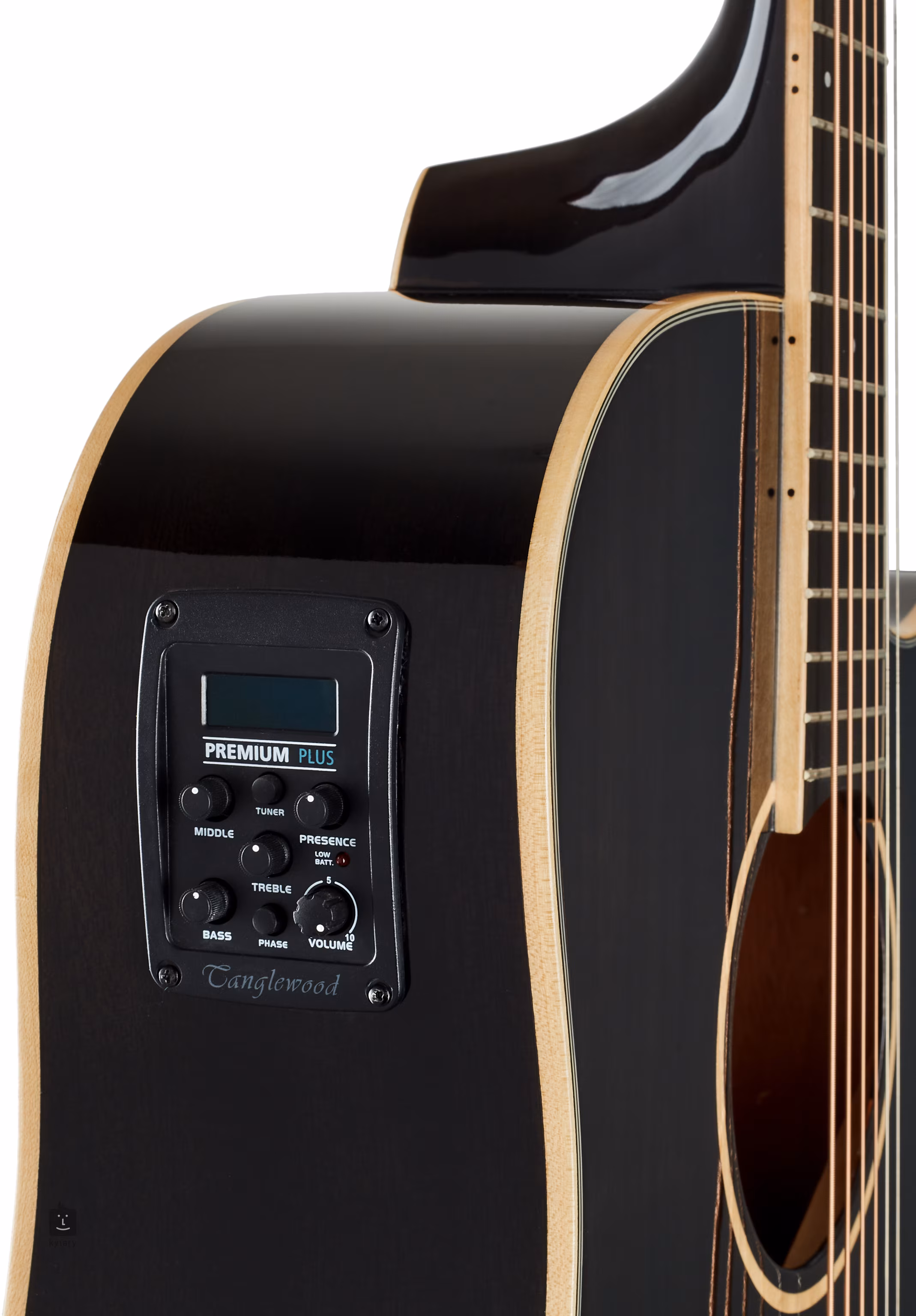 Zur Klangverstärkung steht der hauseigene TW Premium Plus Vorverstärker mit Vierband-EQ, Phase-Funktion und integriertem Stimmgerät zur Verfügung. Die Saiten werden in verchromten Druckguss-Mechaniken und einer Composite-Kopfplatte über NuBone-Null- und Sattelbünde gehalten. Die schöne Verarbeitung wird durch den Ahornkorpus und das Rosetten-Binding, den Mittelstreifen auf der Bodenplatte, die Perlmutt-Positionspunkte (MoP) und das Black Shadow Gloss-Finish auf der Frontplatte akzentuiert.