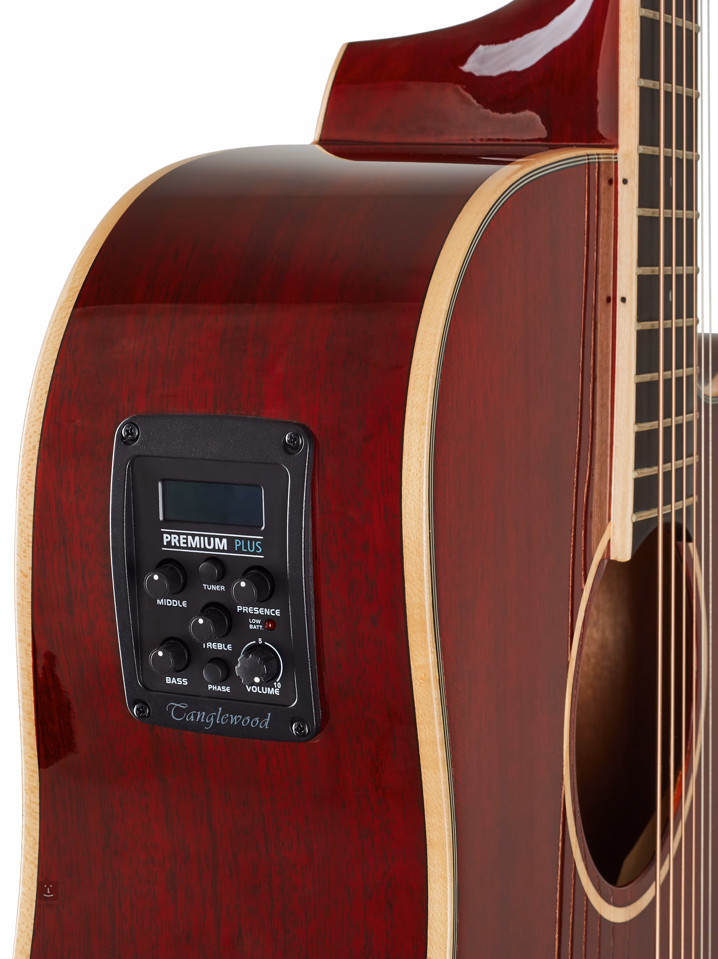 Zur Klangverstärkung gibt es den TW Premium Plus Vorverstärker mit Vierband-EQ, Phase-Funktion und integriertem Stimmgerät. Die Saiten werden in verchromten Grover-Mechaniken und einer Composite-Kopfplatte über NuBone-Null- und Sattelbünde gehalten. Die schöne Verarbeitung wird durch das doppelseitige helle Body-Binding und das Red Gloss Top-Finish akzentuiert.