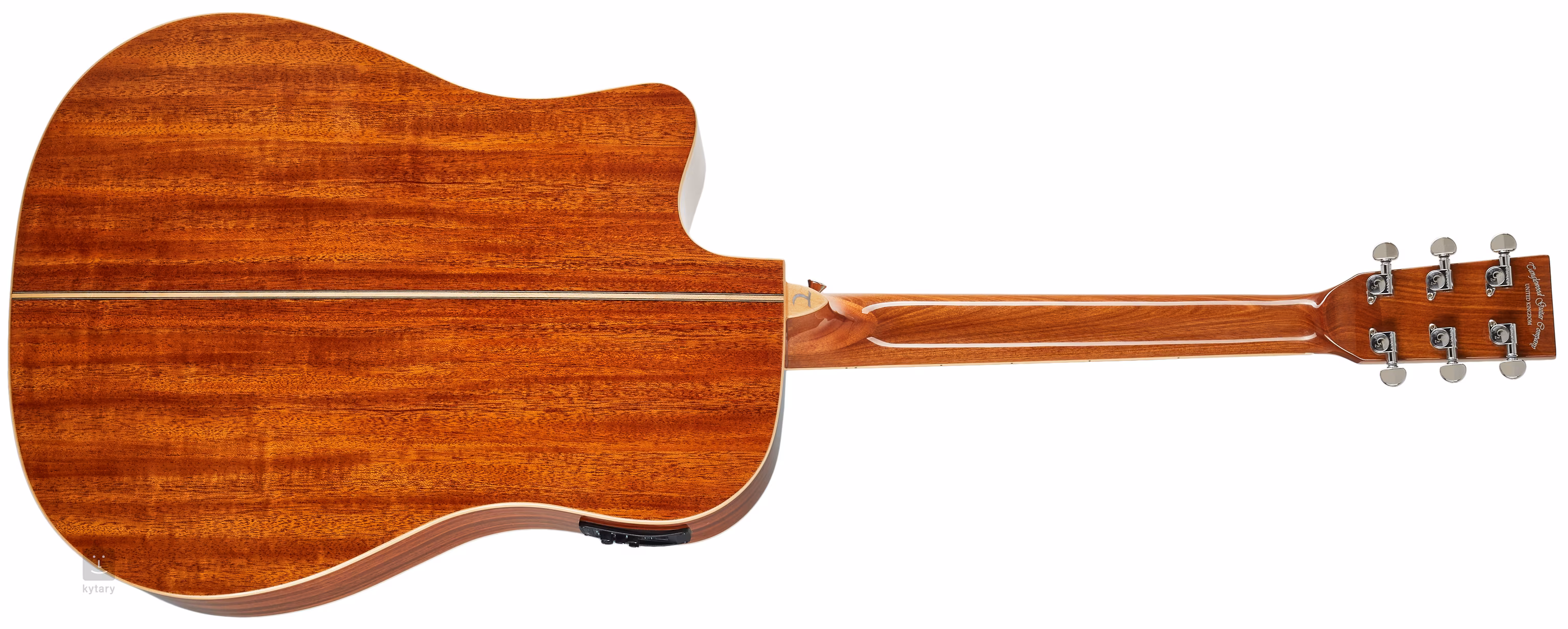 Die TW5 CE NA ist eine elektroakustische Dreadnought-Gitarre. Die Vorderseite der Gitarre besteht aus massivem Zedernholz, während der Boden und die Zargen aus Mahagoniholz gefertigt sind. Der Hals aus Nato-Holz, dem so genannten östlichen Mahagoni, ist auf ein Eboncore-Verbundgriffbrett mit 20 Bünden geklebt. Eine praktische untere Korpusaussparung erleichtert das Spielen in den höheren Lagen des Griffbretts.