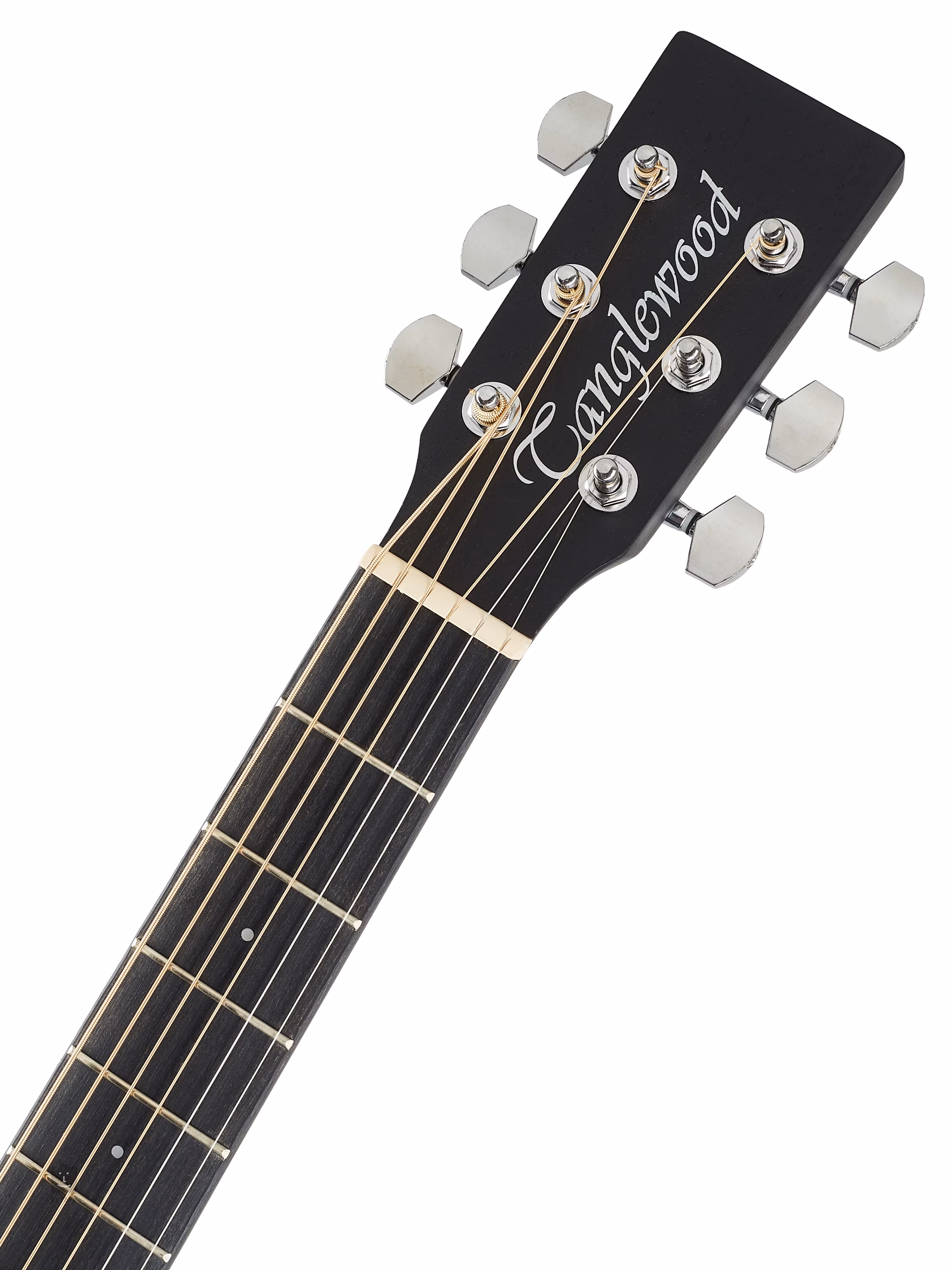 Die Tanglewood Blackbird TWBB SD E ist eine Dreadnought Slope Shoulder elektroakustische Gitarre. Der Korpus der Gitarre ist aus laminiertem afrikanischen Mahagoni gefertigt. Der Hals ist am vierzehnten Bund mit dem Korpus verbunden, die Oberfläche des Griffbretts aus Verbundmaterial ist durch zwanzig Bünde und Orientierungspunkte unterteilt. Die Saiten sind in verchromten Die-Cast-Mechaniken und einem Composite-Griffbrett gelagert. Das Vintage-Feeling und die Haptik des Instruments werden durch die Smokestack Black Satin Lackierung der Decke noch verstärkt.