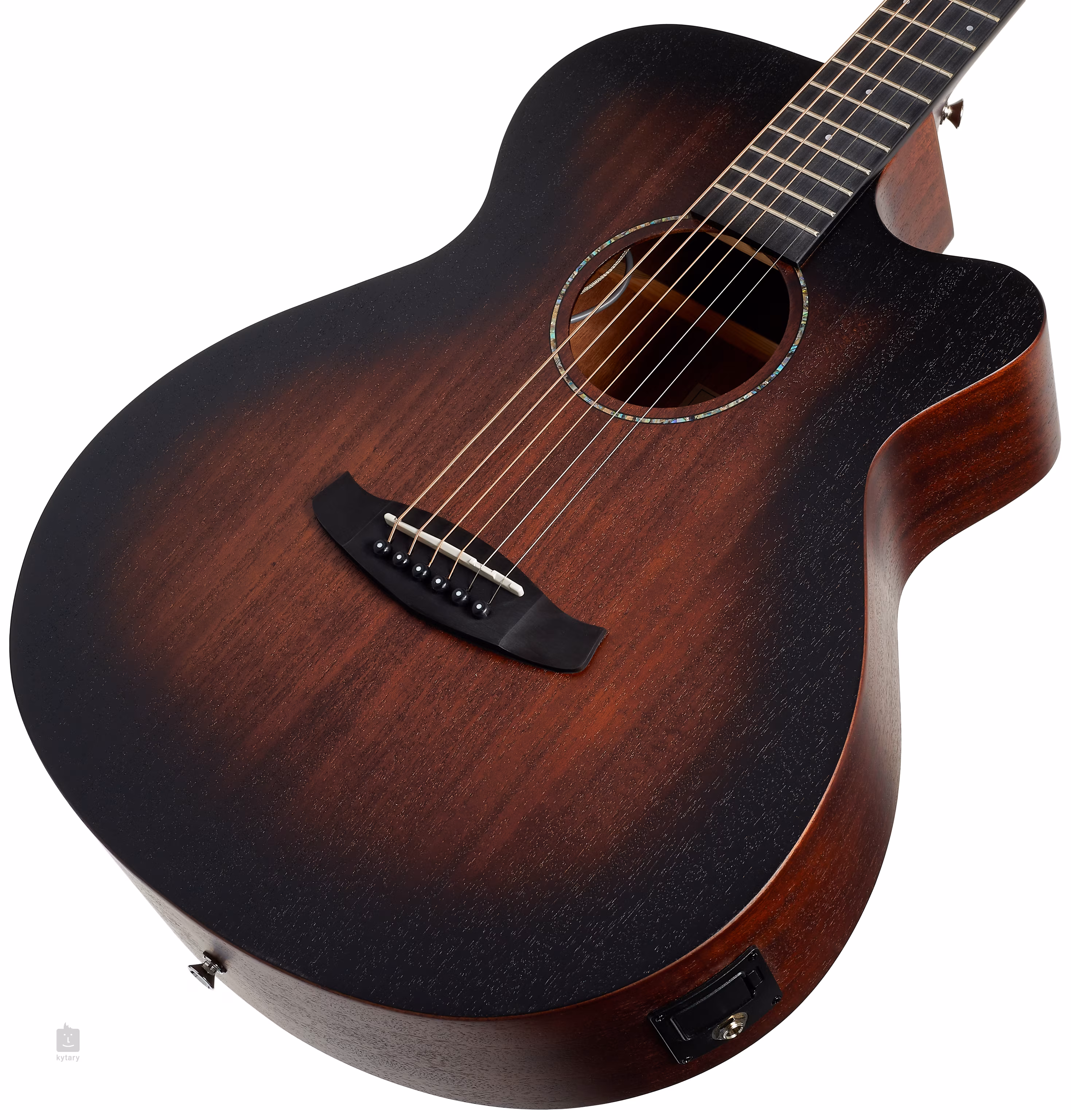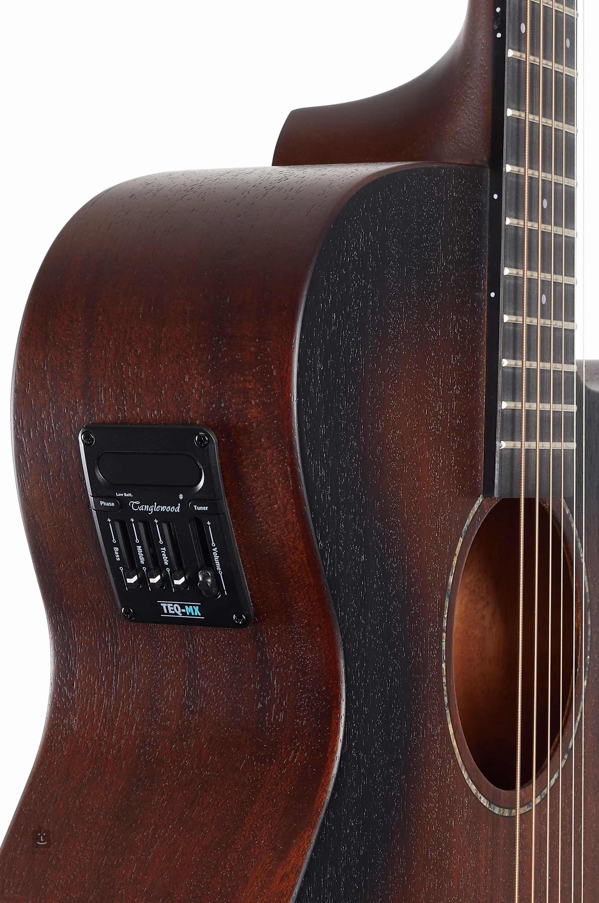 Der Korpus der elektroakustischen Gitarre Tanglewood Crossroads TWCRSFCE Orchestra/Folk ist aus laminiertem Mahagoni gefertigt. Ein Griffbrett aus Ebenholz ist auf den Mahagoni-Hals geleimt. Positionspunkte auf dem Griffbrett erleichtern die Orientierung. Die Saiten sind in verchromten Druckgussmechaniken und einer Komposit-Kopfplatte gelagert.