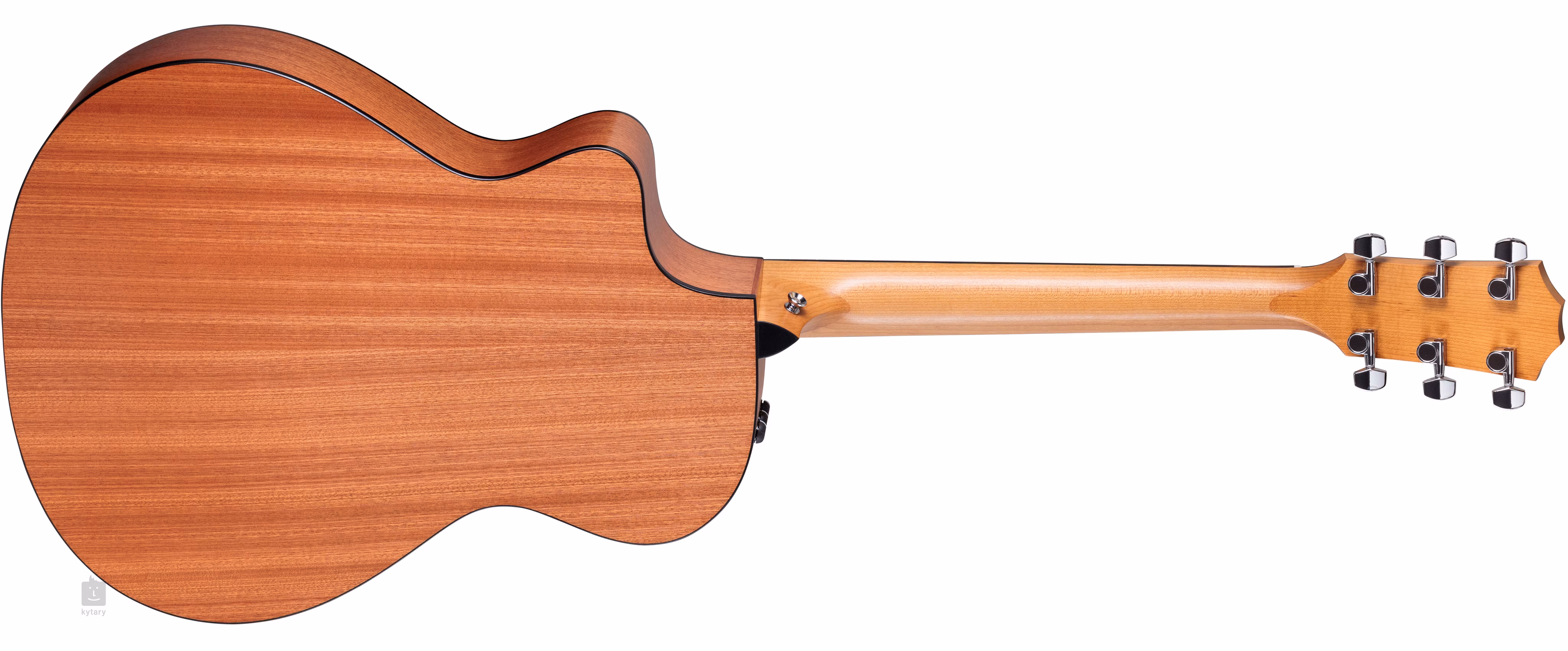 Die Stimmstabilität wird durch die NuBone-Nullbund-Saitenbefestigung in der Ebenholz-Kopfplatte und die Taylor-Mechaniken aus Chromdruckguss gewährleistet. Das stilvolle Aussehen des Instruments wird durch traditionelle Elemente in Form eines schwarzen Schlagbretts, eines schwarzen Korpusbindings und einer aus drei Ringen bestehenden Rosette akzentuiert.