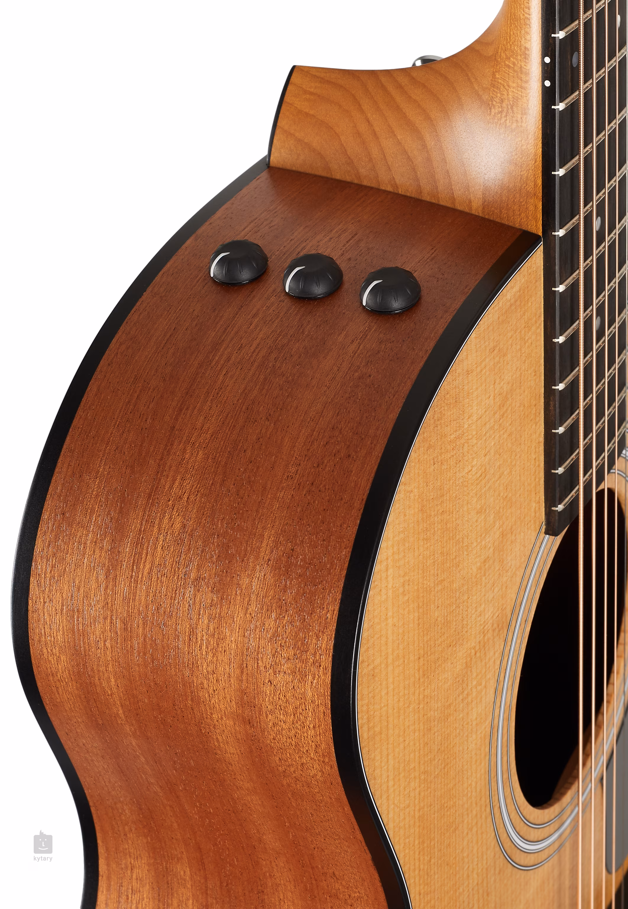 Die Saiten werden in verchromten Taylor-Mechaniken aus Druckguss über einem Micarta-Sattel und einem NuBone-Griffbrett gehalten. Die schöne Verarbeitung wird durch traditionelle Elemente in Form einer aus drei Ringen bestehenden Rosette, schwarzem Body Binding und einem praktischen schwarzen Schlagbrett akzentuiert.