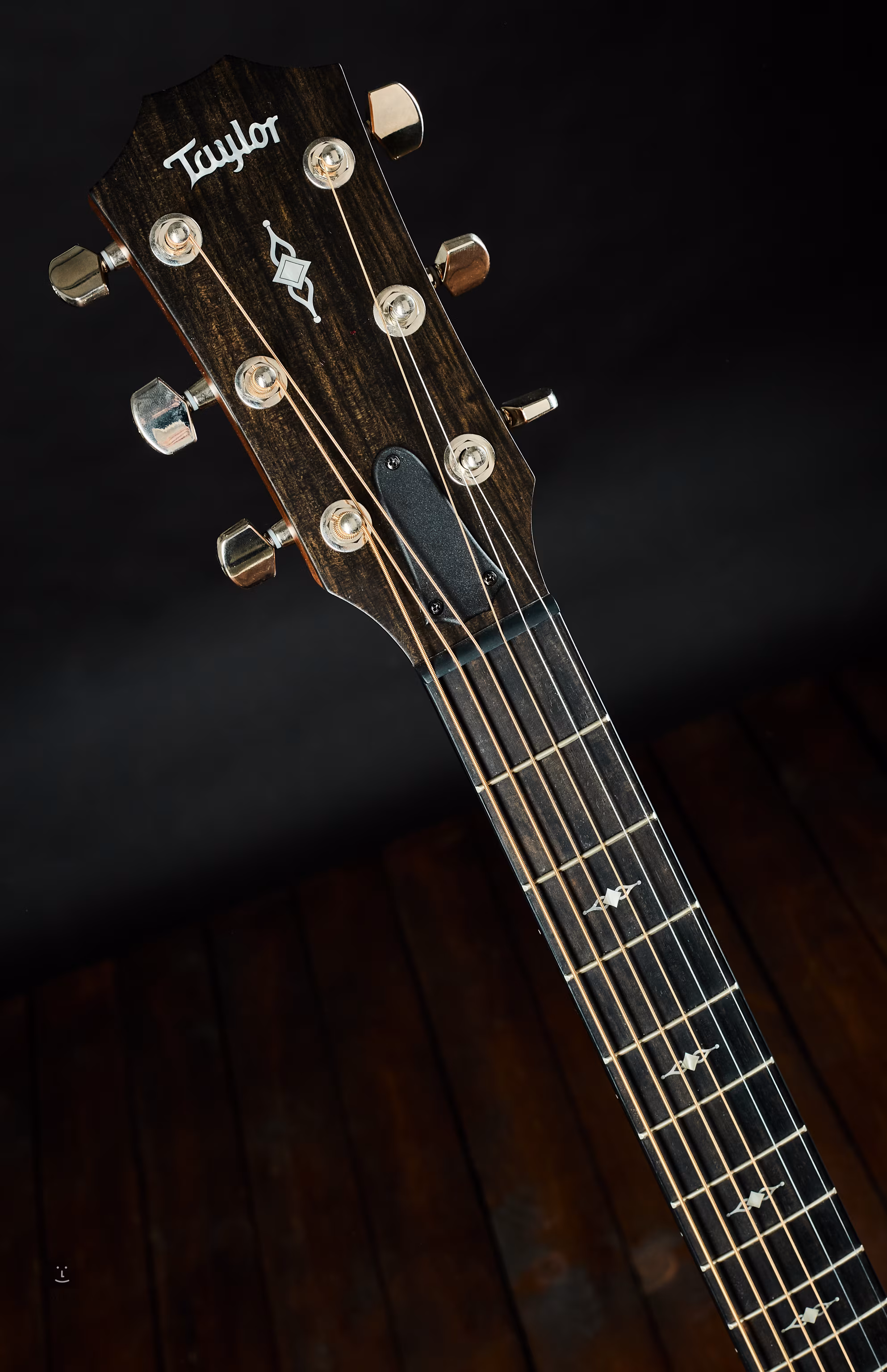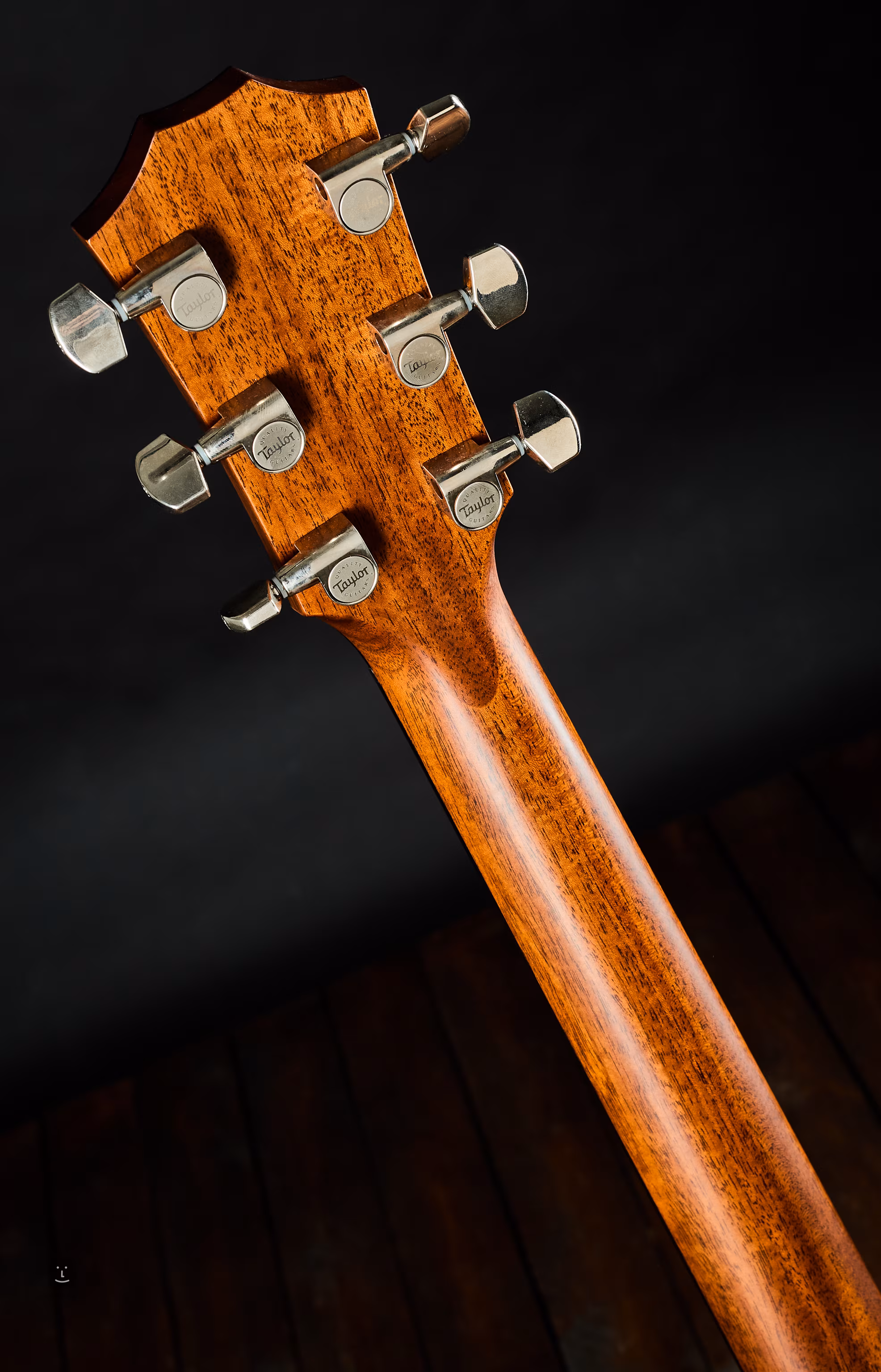 Das Instrument ist mit dem patentierten V-Class-Rippendesign ausgestattet. Die Decke ist aus massiver Sitka-Fichte, der Boden und die Zargen sind aus massivem Sapeli. Der Mahagonihals hat ein Ebenholzgriffbrett mit dekorativen Positionsmarkierungen. Der untere Ausschnitt des Korpus (Venetian Cutaway) ermöglicht auch in den höheren Lagen ein gutes Spielgefühl. Die Gitarre ist mit der originalen Taylor Expression System 2-Elektronik ausgestattet, die drei unabhängige piezoelektrische Tonabnehmer hinter dem Steg verwendet.