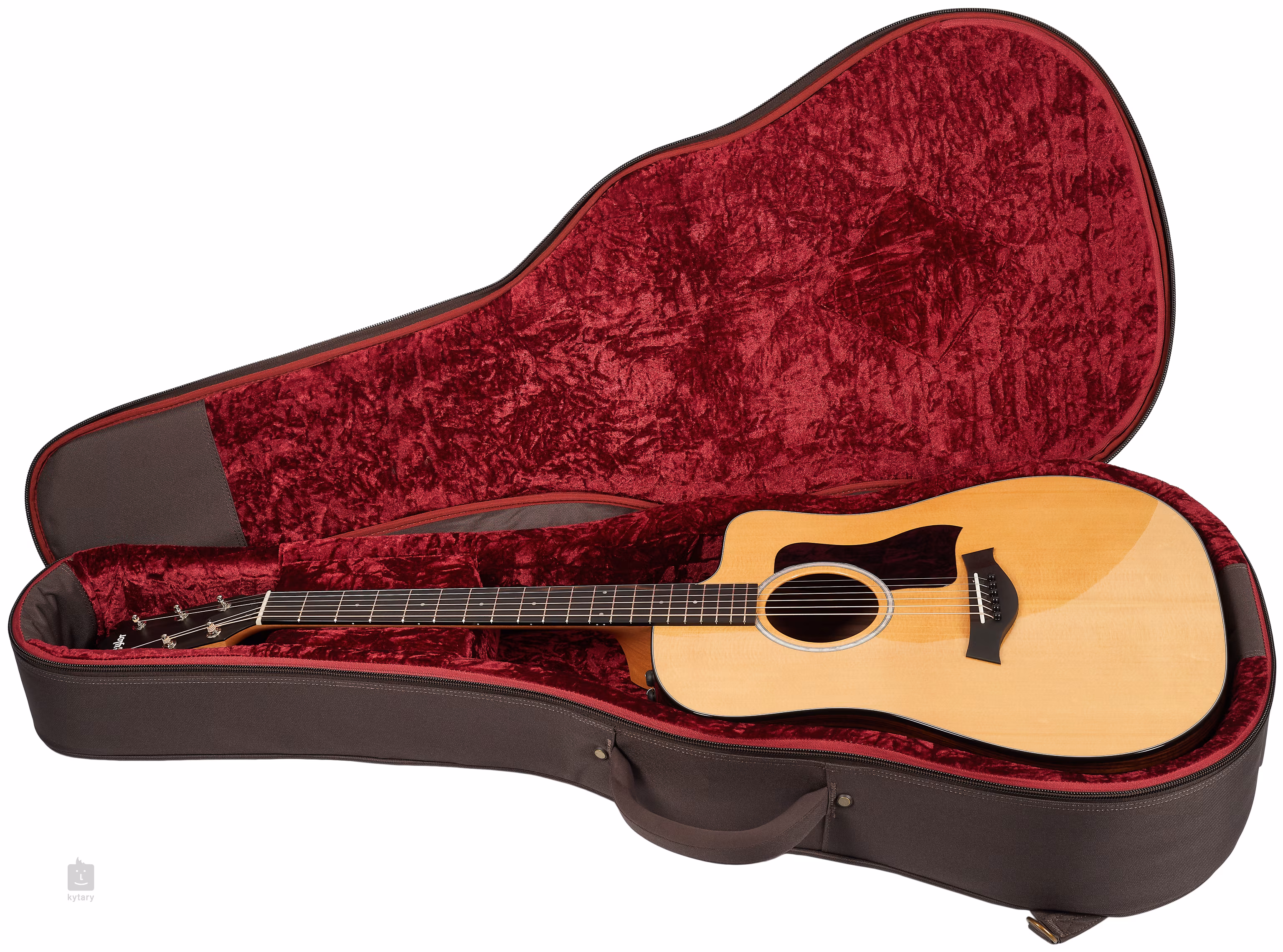 Der Mahagoni-Hals ist mit einem Ebenholz-Griffbrett mit zwanzig Bünden verleimt. Ein dezent abgerundeter unterer Korpusausschnitt (Venetian Cutaway) erleichtert das Anschlagen in den höheren Lagen des Griffbretts. Die Stimmstabilität wird durch die NuBone-Saitenbefestigung über dem Nullbund in der Ebenholz-Kopfplatte und Taylor-Nickel-Mechaniken gewährleistet. Das stilvolle Aussehen des Instruments wird durch traditionelle Elemente in Form eines schwarzen Schlagbretts, eines schwarzen Korpusbindings und eines Ebenholzfurniers auf der Kopfplatte, das mit dem Taylor-Logo verziert ist, akzentuiert.