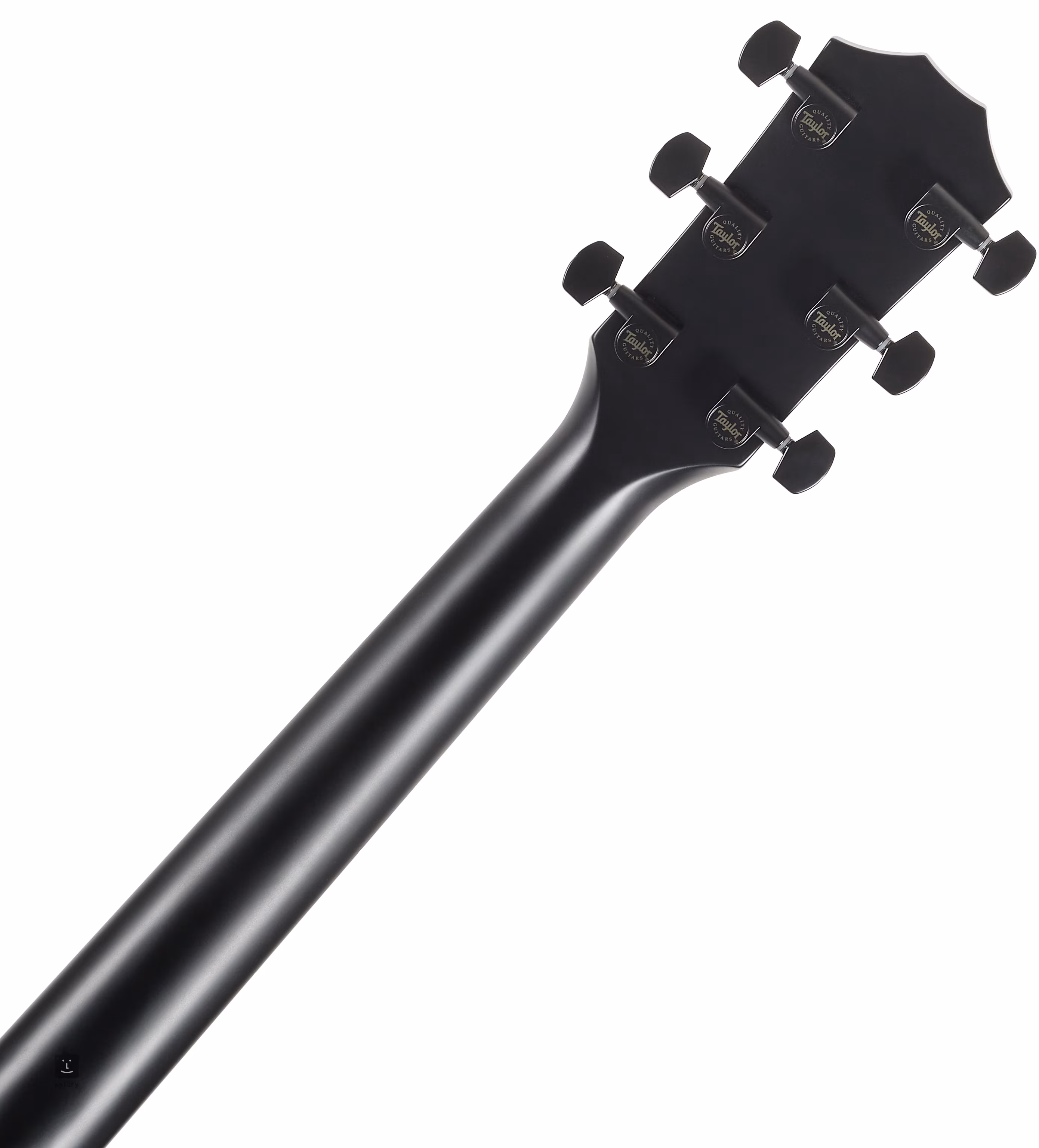 Der Mahagoni-Hals ist mit einem Ebenholz-Griffbrett mit zwanzig Bünden verleimt. Eine dezent abgerundete untere Korpusaussparung (Venetian Cutaway) erleichtert das Anschlagen in den höheren Lagen des Griffbretts. Die Stimmstabilität wird durch die NuBone-Saitenbefestigung über dem Nullbund in der Ebenholzkopfplatte und die schwarzen Taylor-Mechaniken gewährleistet. Der stilvolle Look des Instruments wird durch traditionelle Elemente in Form einer weißen, umlaufenden Korpusverkleidung, Positionsmarkierungen auf dem Griffbrett in Form von kleinen Perlmuttimitaten, einer Rosette aus Perlmuttimitat und einem schwarzen Schlagbrett unterstrichen.