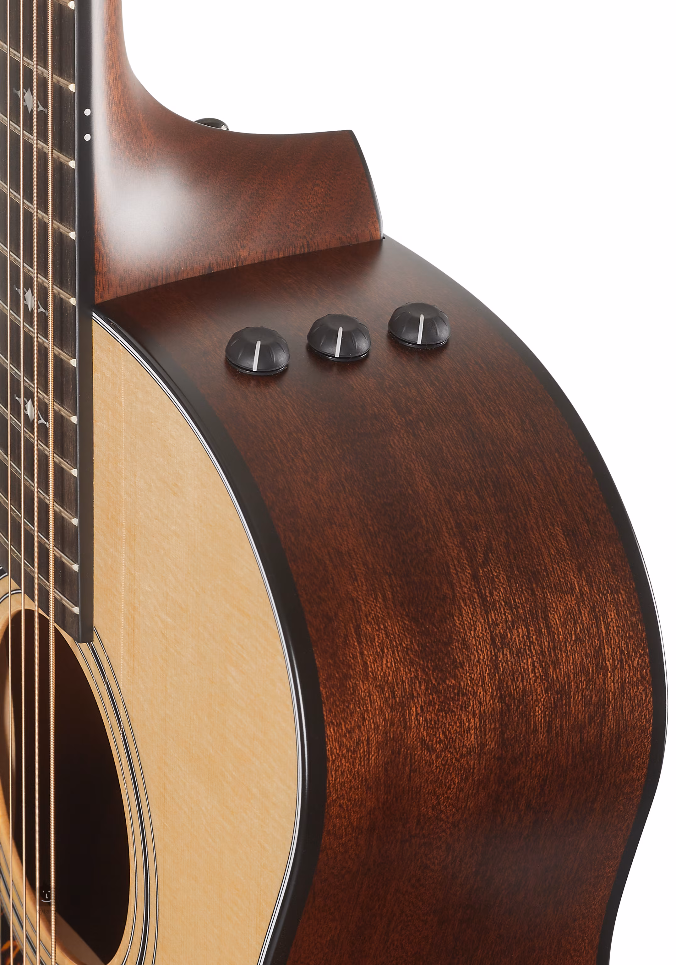 Die Gitarre ist mit hochwertiger Firmenelektronik ausgestattet. Das Taylor Expression System 2 verwendet drei speziell entwickelte und individuell kalibrierte Piezo-Tonabnehmer, die sich hinter dem Griffbrett befinden. Anders als herkömmliche Tonabnehmer nehmen sie nicht die Auf- und Abwärtsbewegung des Brettes wahr, sondern die natürliche Hin- und Herschwingung des Griffbretts. Dadurch wird der Klang des Instruments viel natürlicher, farbiger und angenehmer und reagiert besser auf die Dynamik Ihres Spiels. Gleichzeitig ist das Signal dank des neuen Vorverstärkers 25 % stärker. Natürlich gibt es keine Rückkopplungen mehr und Sie können Lautstärke, Bässe und Höhen einstellen.