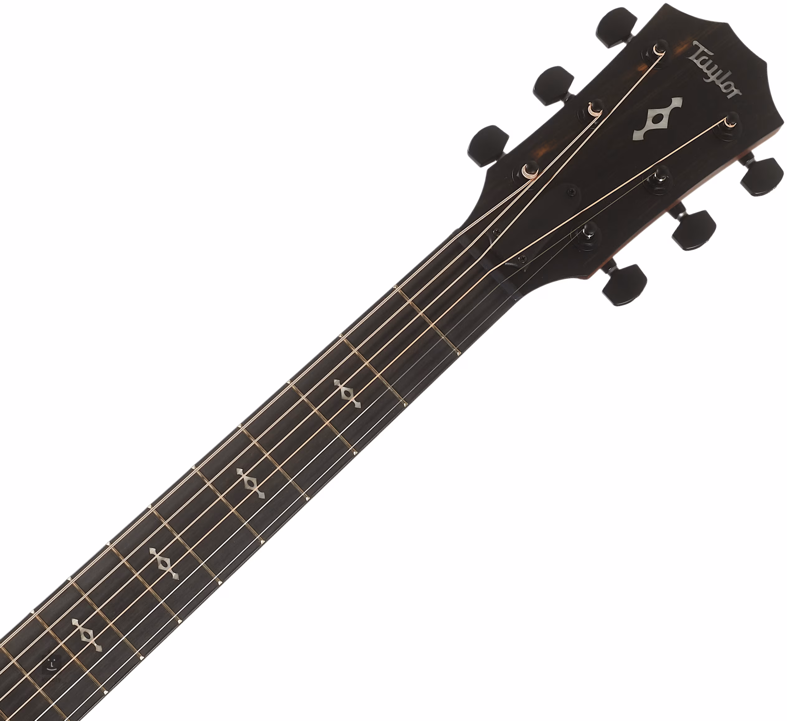 Die stilvolle Verarbeitung wird durch die Oberflächenbehandlung der Decke in Shaded Edgeburst, schwarze Taylor-Stimmmechaniken, schwarze Korpusumrandung mit schwarz-weißem Einlage, Ebenholzfurnier auf dem Kopf der Gitarre und Firestripe-Pickguard unterstrichen.