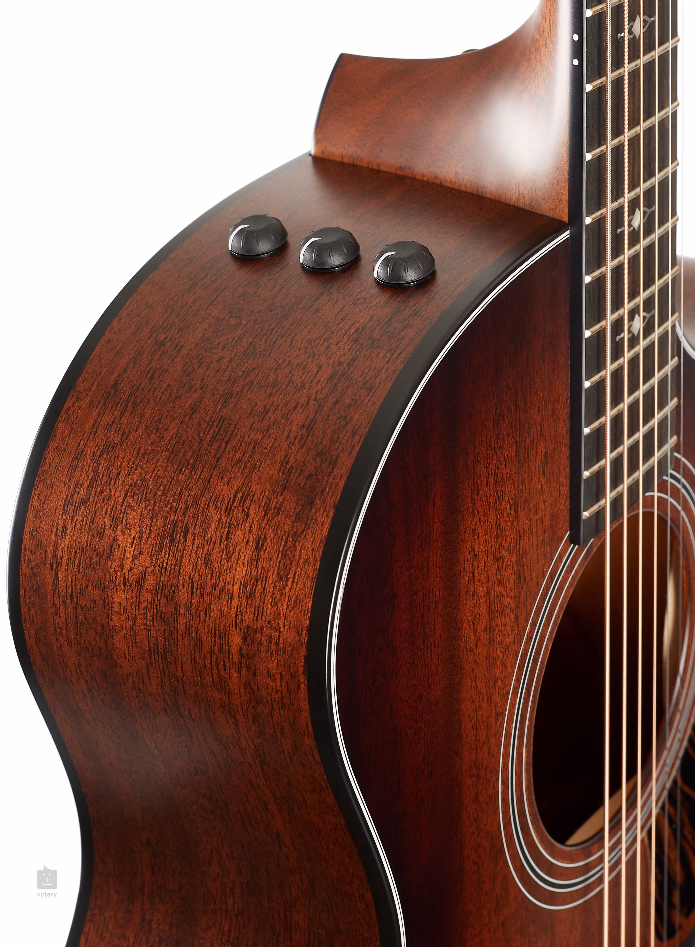 Der Mahagonihals ist mit einem Ebenholzgriffbrett mit zwanzig Bünden verleimt. Eine abgerundete untere Korpusaussparung (venezianisch) erleichtert das Erreichen der höheren Lagen des Griffbretts, und dekorative Positionsmarkierungen erleichtern die Orientierung auf dem Griffbrett. Die stilvolle Verarbeitung wird durch die Shaded-Edgeburst-Lackierung der Decke, schwarze Taylor-Mechaniken, schwarzes Korpusbinding, Ebenholzfurnier an der Kopfplatte und ein Schlagbrett mit Feuerstreifen unterstrichen.