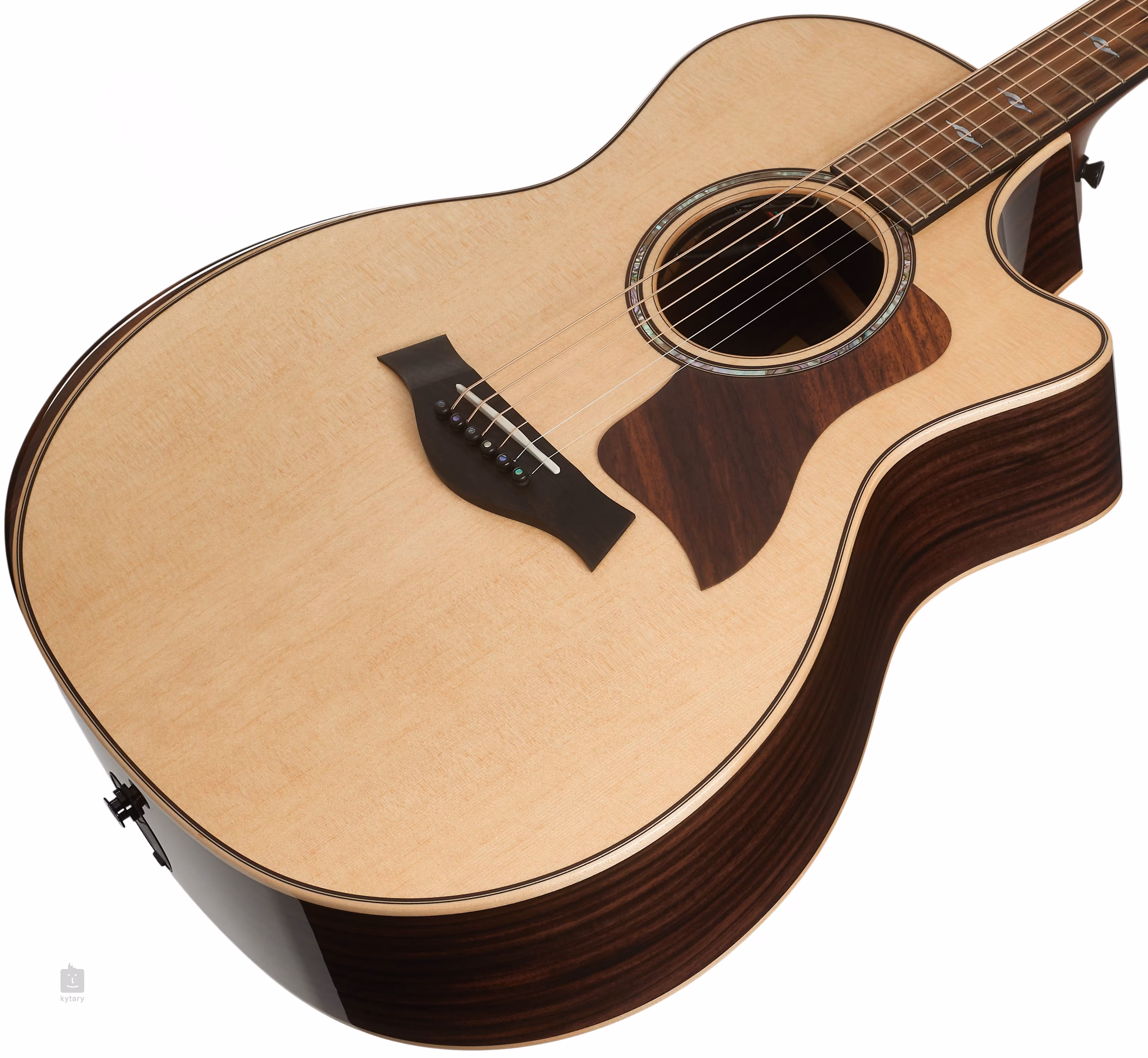 Die stilvolle Verarbeitung wird durch eine Ahorn-Einlage mit Palisander-Einlage, eine Rosette aus Abalone- und Palisanderringen, ein Palisander-Schlagbrett, dekorative Perlmutt-Positionsmarkierungen (Mother of Pearl) und Ebenholz-Stimmwirbel mit Perlmutt-Punkten und Ebenholzfurnier auf dem Kopf der Gitarre, verziert mit einem Perlmutt-Logo (Mother of Pearl) von Taylor.