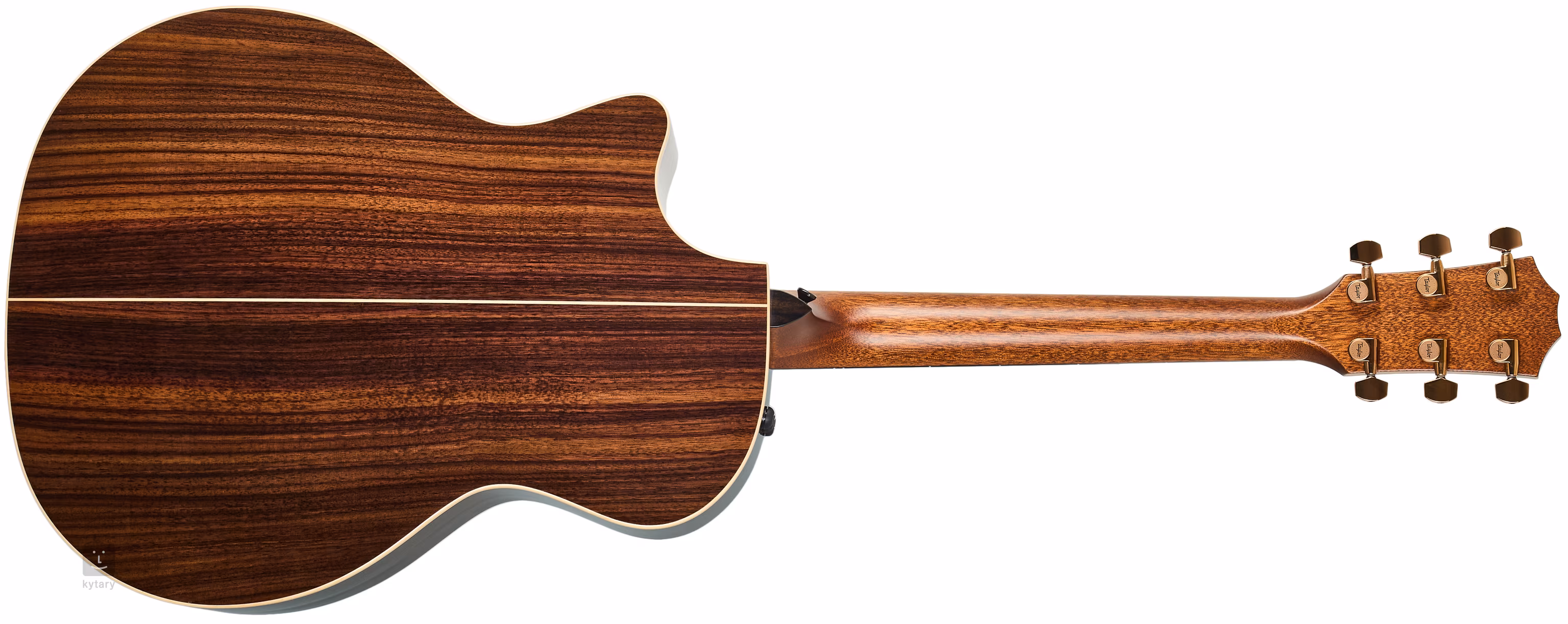 Ein Griffbrett aus Kamerun-Ebenholz mit 20 Bünden ist auf den Mahagoni-Hals geklebt. Eine dezent abgerundete untere Korpusaussparung erleichtert das Spielen in höheren Griffbrettpositionen, während eine ergonomische Armauflage für optimalen Spielkomfort sorgt. Die Stimmstabilität wird durch die Saitenbefestigung über den Black TusQ-Nullbund in der Ebenholzkopfplatte und die hauseigene Smoked Nickel-Mechanik gewährleistet. Zu den weiteren Styling-Merkmalen gehören ein Korpus aus Ahorn, der durch ein Palisander-Griffbrett ergänzt wird, eine Rosette aus Perlmutt (Abalone) und Ringen aus Palisander, ein Palisander-Schlagbrett, dekorative Perlmutt-Positionsmarker, Ebenholz-Wirbel am Hals mit Perlmutt-Punkten und eine Kopfplatte aus Ebenholzfurnier, die mit einem Taylor-Logo aus Perlmutt verziert ist.