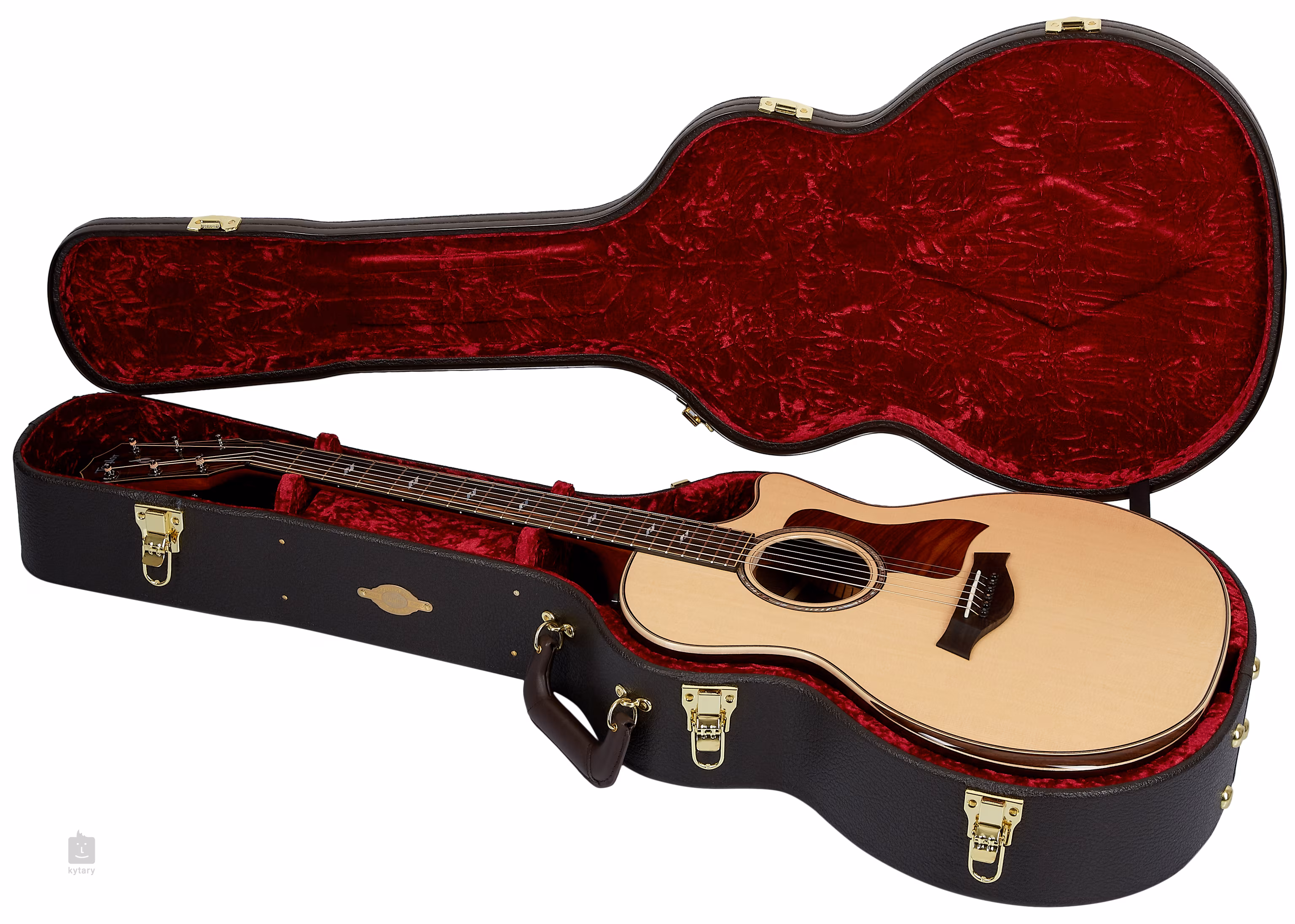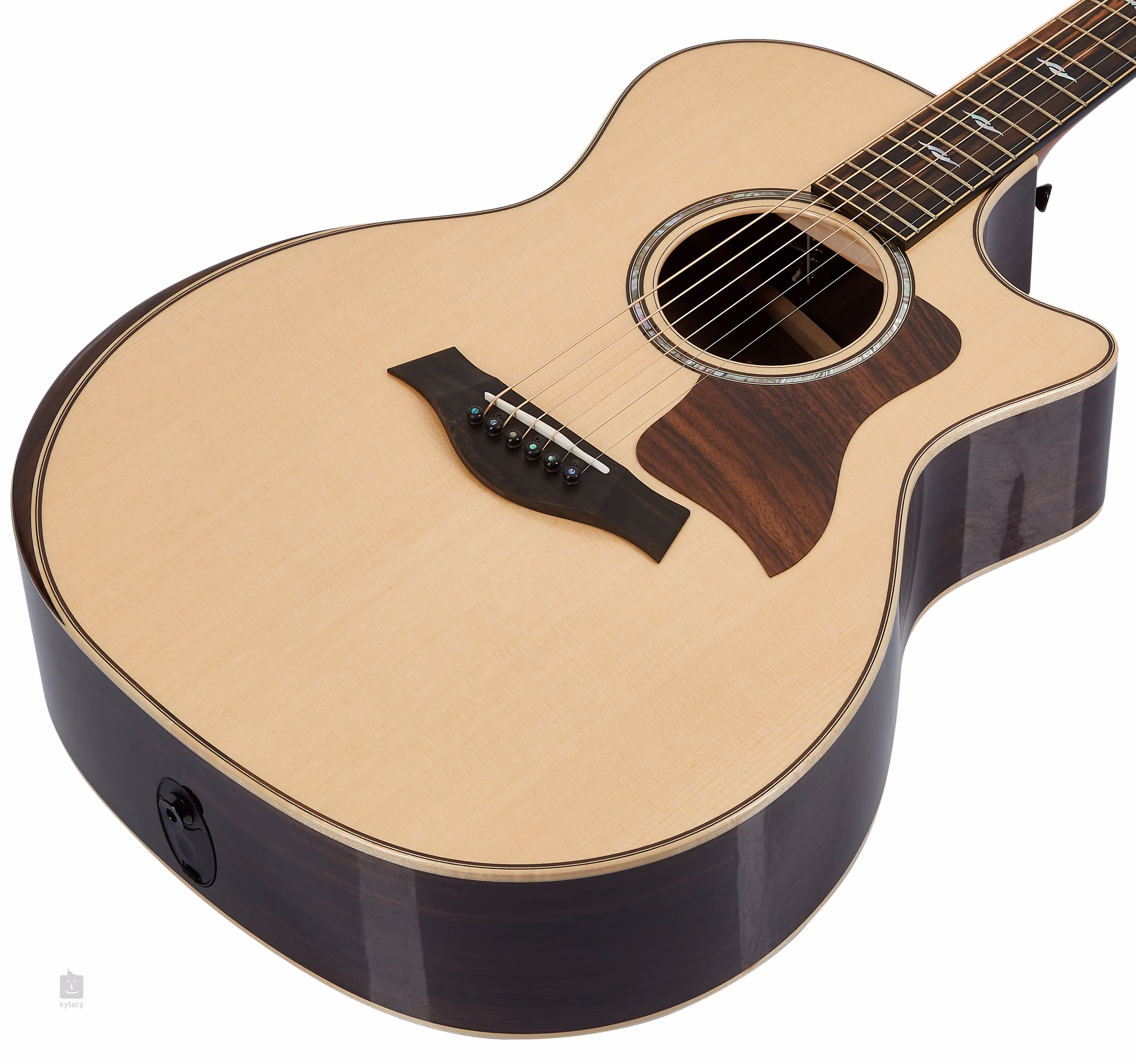 Ein Griffbrett aus Kamerun-Ebenholz mit 20 Bünden ist auf den Mahagoni-Hals geklebt. Eine dezent abgerundete untere Korpusaussparung erleichtert das Spielen in höheren Griffbrettpositionen, während eine ergonomische Schulterstütze (ein Merkmal, das von der Deluxe-Serie übernommen wurde) für optimalen Spielkomfort sorgt. Die Stimmstabilität wird durch die Befestigung der Saiten über den Black TusQ-Nullbund im Ebenholzgriffbrett und die Smoked-Nickel-Mechanik des Unternehmens gewährleistet. Zu den weiteren Styling-Merkmalen gehören ein Ahorn-Binding, das durch ein Palisander-Griffbrett ergänzt wird, eine Rosette aus Perlmutt (Abalone) und Palisander-Ringen, ein Palisander-Schlagbrett, dekorative Perlmutt-Positionsmarker, Ebenholz-Wirbel im Griffbrett mit Perlmutt-Dots und eine Kopfplatte aus Ebenholz-Furnier, die mit einem Taylor-Logo aus Perlmutt verziert ist.