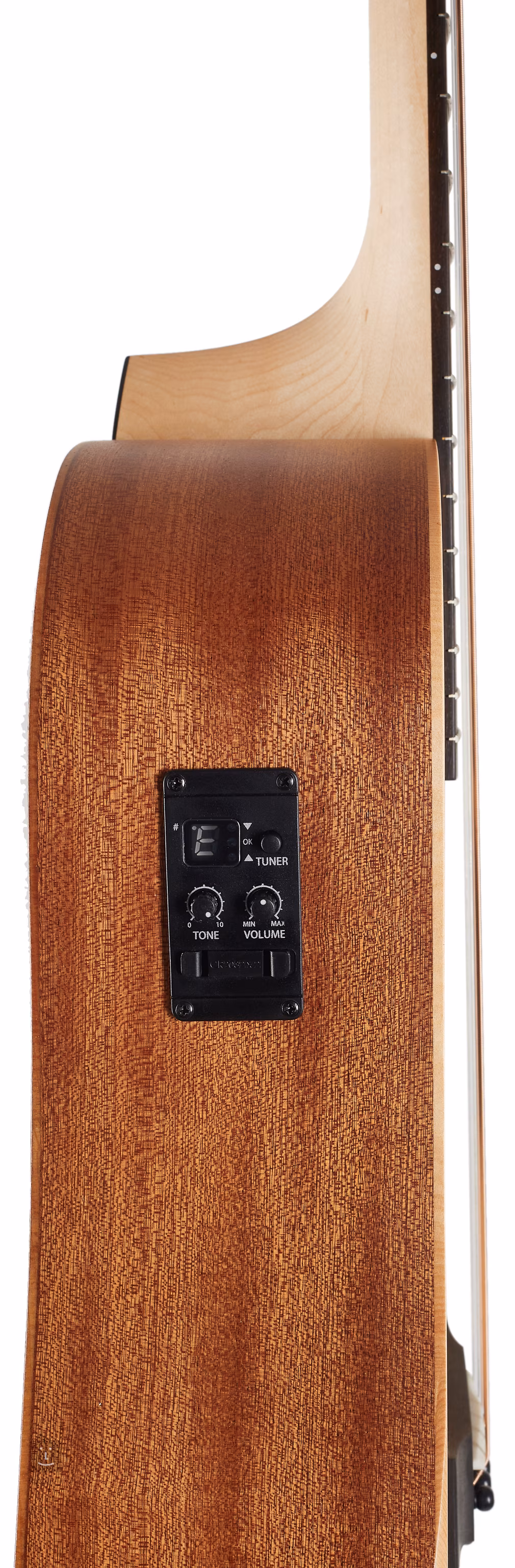 Der Klang der Gitarre wird durch den im hinteren Teil des Instruments eingebauten ES-B-Vorverstärker erzeugt, der auf dem von Taylor entwickelten ES-2-System basiert, einer einzigartigen Methode, den Klang mit drei hinter dem Hals platzierten Piezo-Tonabnehmern einzufangen. Darüber hinaus bietet der Vorverstärker zwei Regler (Tone, Volume), ein eingebautes chromatisches Stimmgerät und eine übersichtliche LED-Anzeige.
