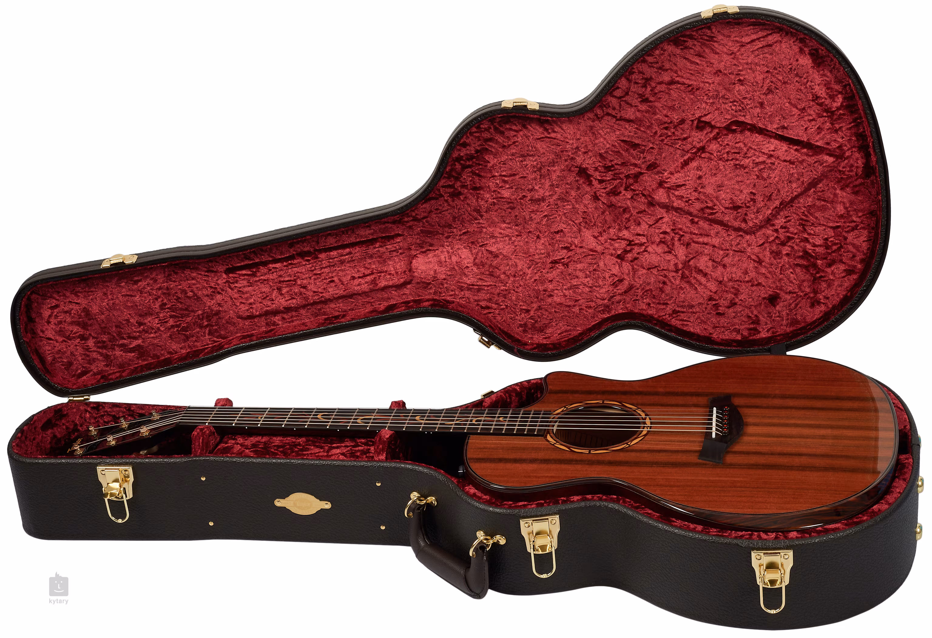 Der Mahagoni-Hals ist mit einem Ebenholz-Griffbrett verleimt, das mit einer Ocean-Vine-Einlage aus luxuriösem Cocobolo und Buchsbaum durchzogen ist. Für eine stabile Stimmung sorgen die Gotoh 510 Saiten in Gold Finish mit Cocobolo-Wirbeln und Ebenholz-Steg. Die luxuriöse Verarbeitung der Gitarre wird durch die Schulterstütze und die Korpusumrandung aus exotischem Cocobolo, Zierrosetten aus Cocobolo und Buchsbaum, Wirbel für die Kopfplatte mit roten Punkten aus australischen Opalen und das Logo auf der Kopfplatte aus Buchsbaum unterstrichen.