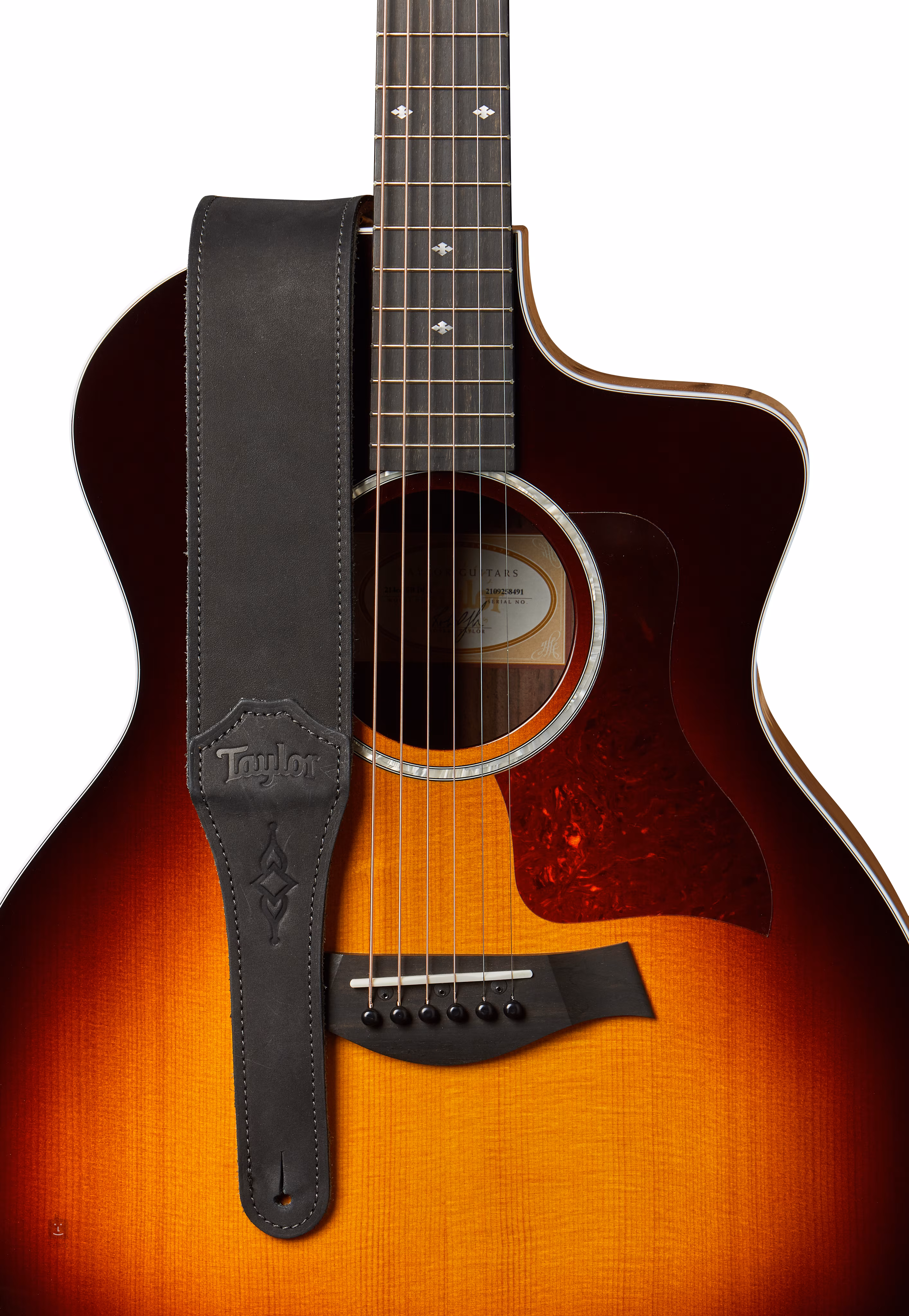 Der Premium-Gitarrengurt von Taylor besteht aus glattem Nubukleder mit einem Futter aus Wildleder, das ihn rutschfest, sehr haltbar und äußerst bequem macht. Das minimalistische Design wird nur durch das geprägte Markenlogo und das Gemstone-Motiv ergänzt.