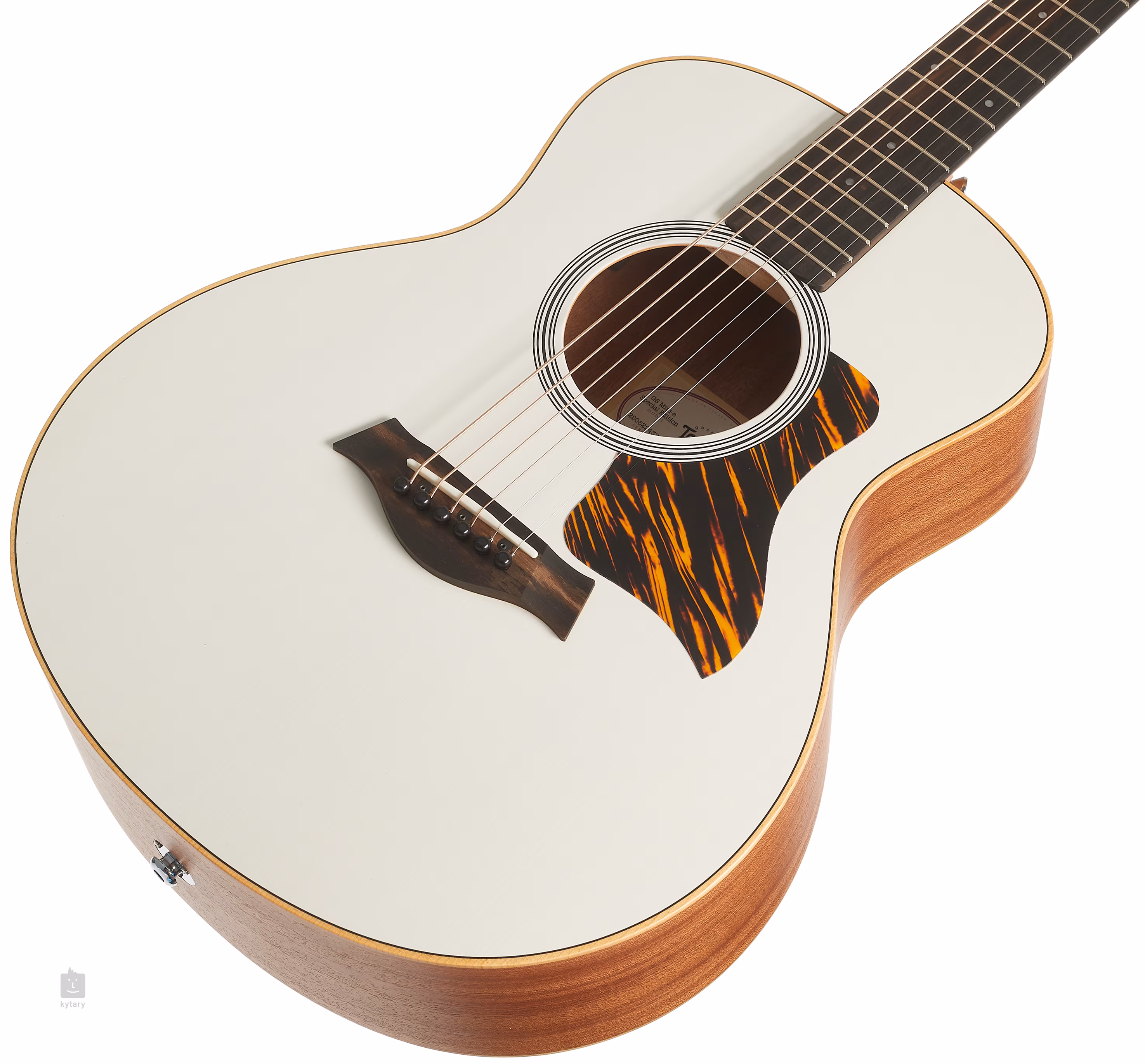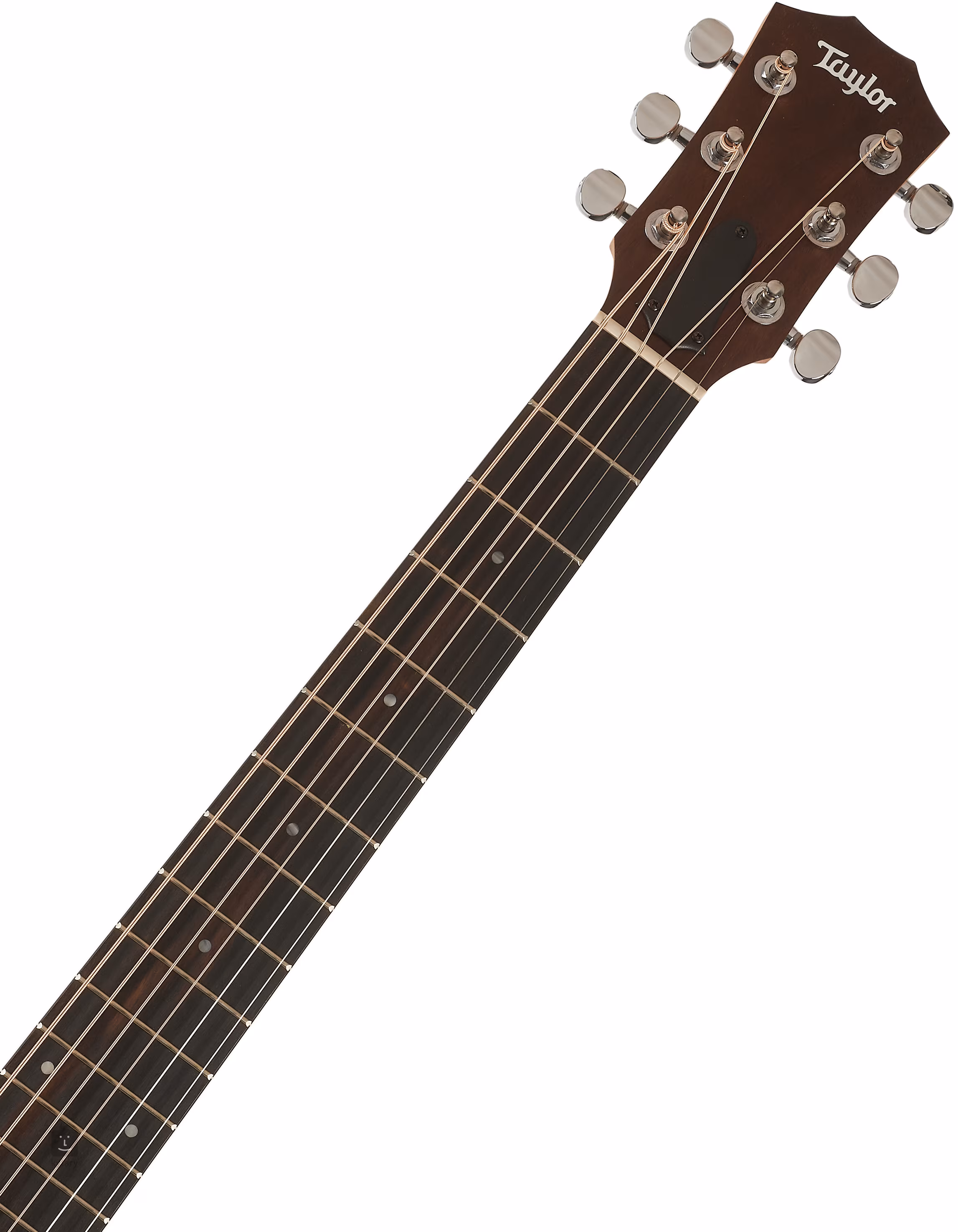 Die Stabilität der Stimmung wird durch die Befestigung der Saiten über den NuBone-Nullbund in der verchromten Taylor-Mechanik und über den Micarta-Sattel in der Ebenholz-Kopfplatte gewährleistet. Das stilvolle Aussehen des Instruments wird durch das Translucent White-Finish auf der Decke, das die Fichtendecke nicht vollständig verdeckt, das Schlagbrett mit Feuerstreifen und das Copafera-Holzfurnier auf der Kopfplatte mit aufgedrucktem Taylor-Logo unterstrichen.