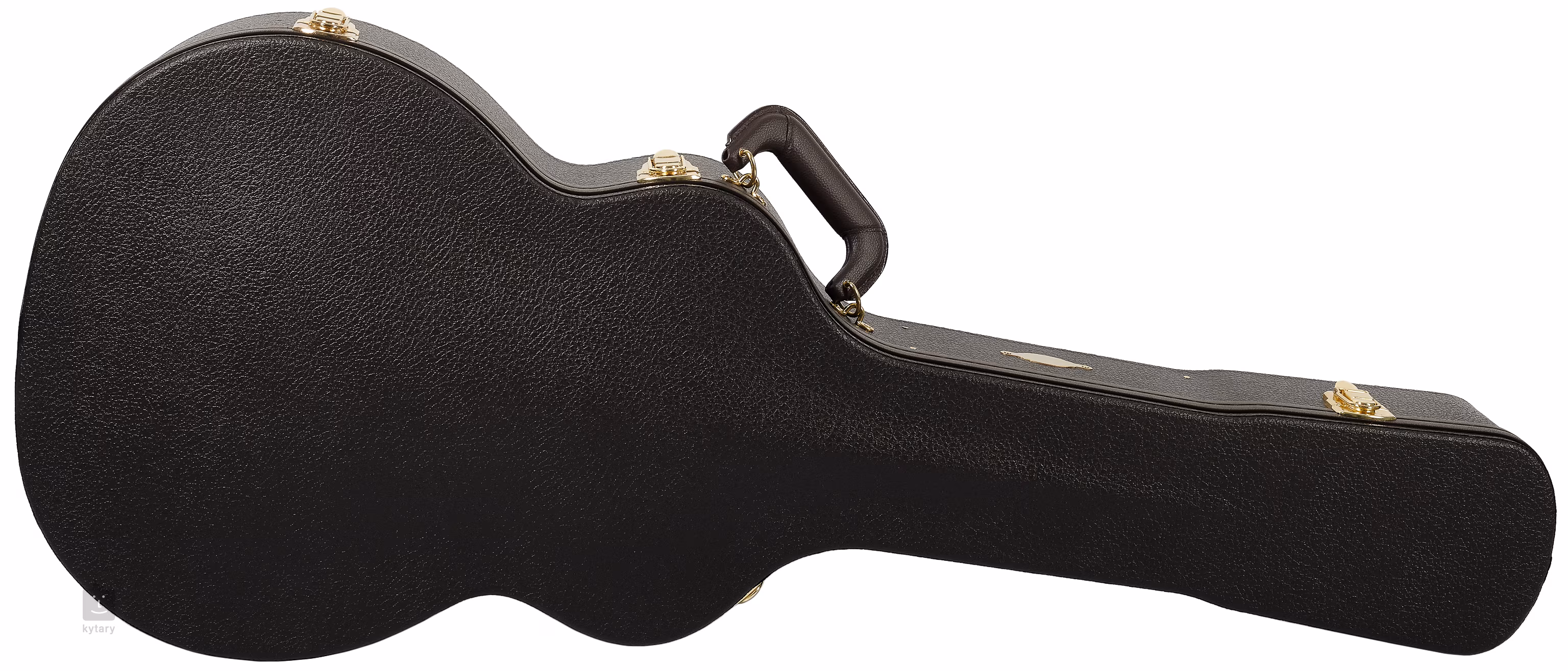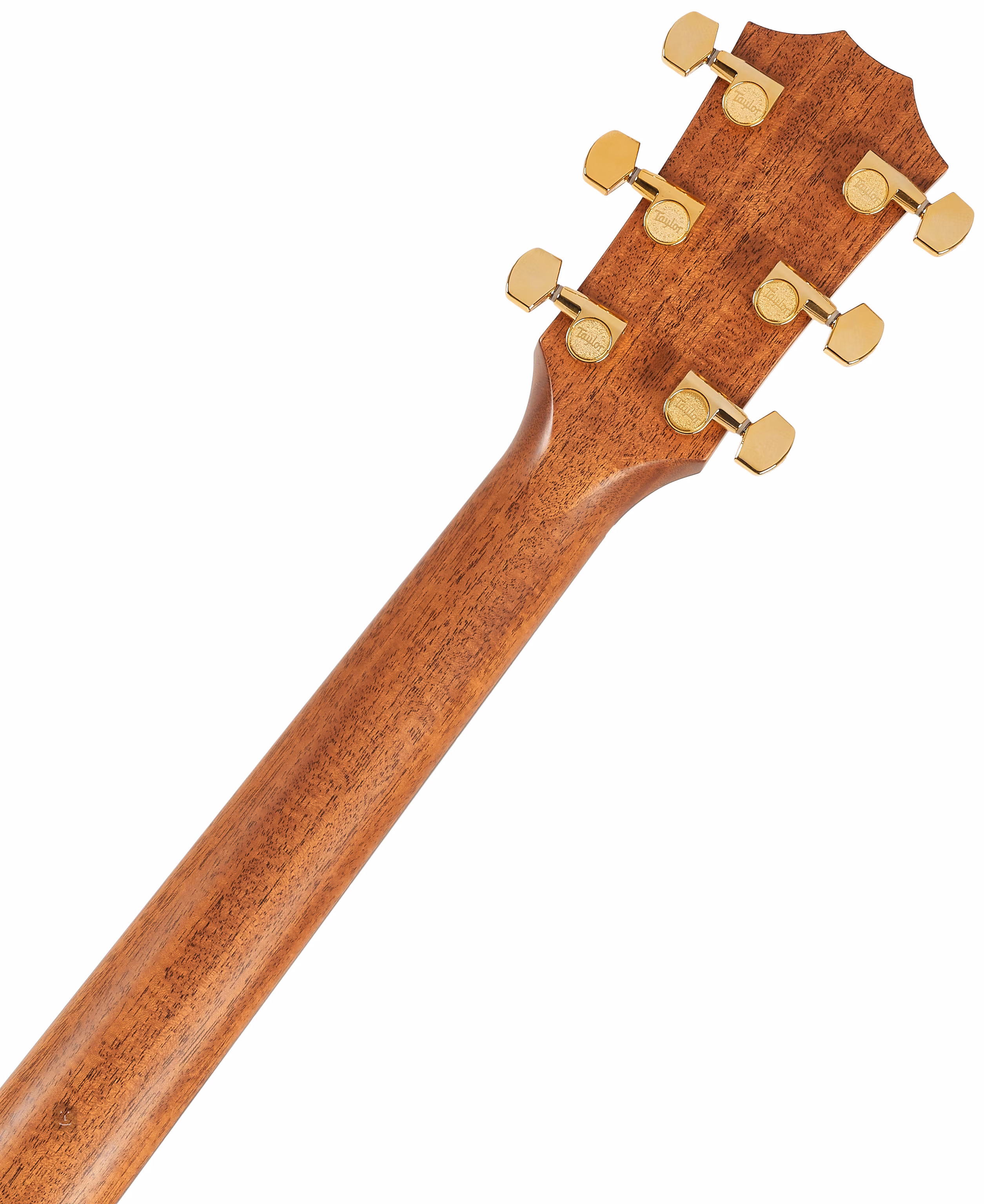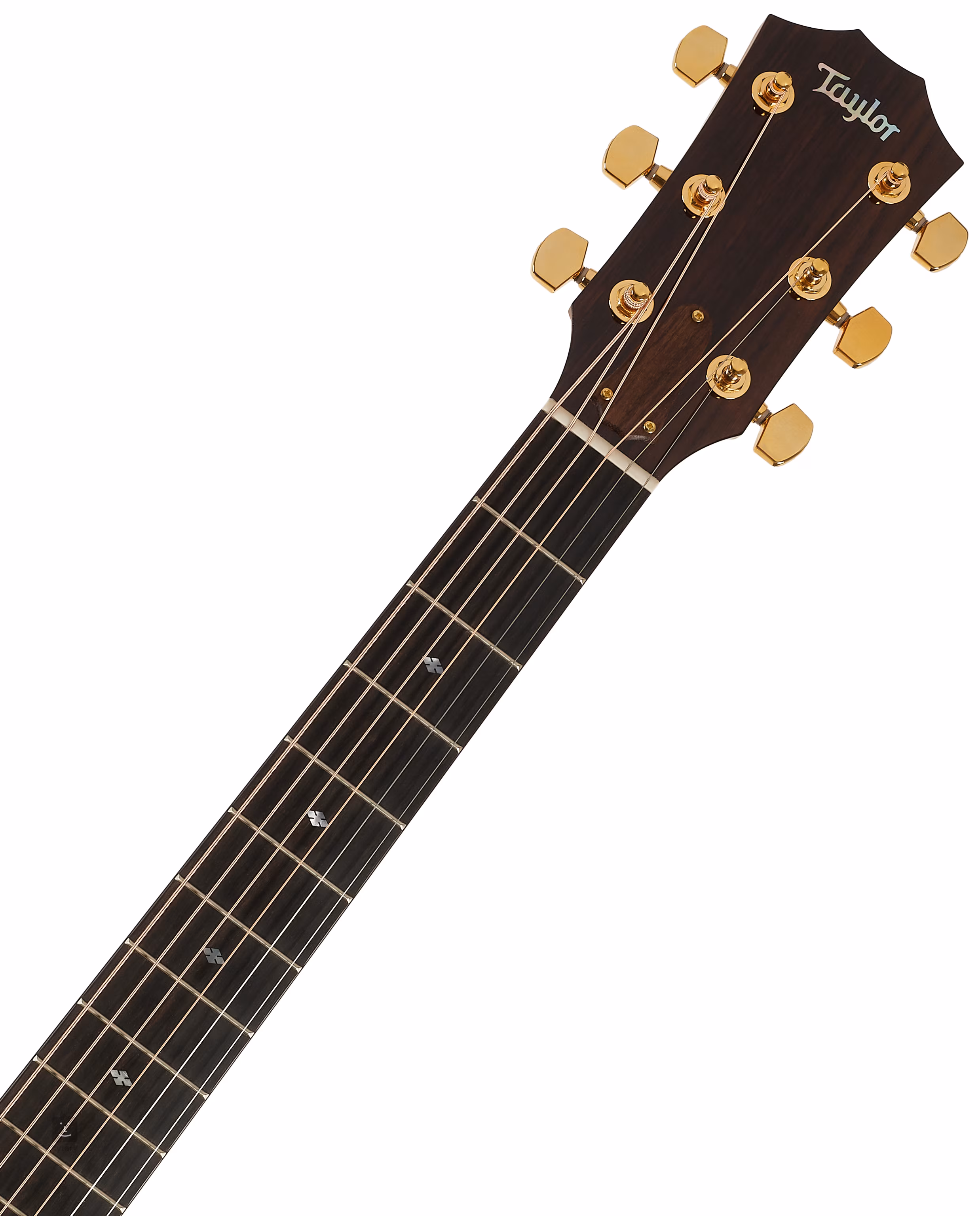 Die Saiten sind in den goldfarbenen Mechaniken des Unternehmens und in einem Ebenholzgriffbrett in moderner Taylor-Form gelagert. Die schöne Verarbeitung wird durch den imitierten Schildpatt-Korpus und das umlaufende Binding des Griffbretts, das schwarz-weiße obere Schlagbrett, die grüne Abalone-Rosette, die Ebenholzwirbel auf dem Griffbrett mit Perlmuttpunkten (Abalone) und das imitierte Schildpatt-Schlagbrett noch unterstrichen.