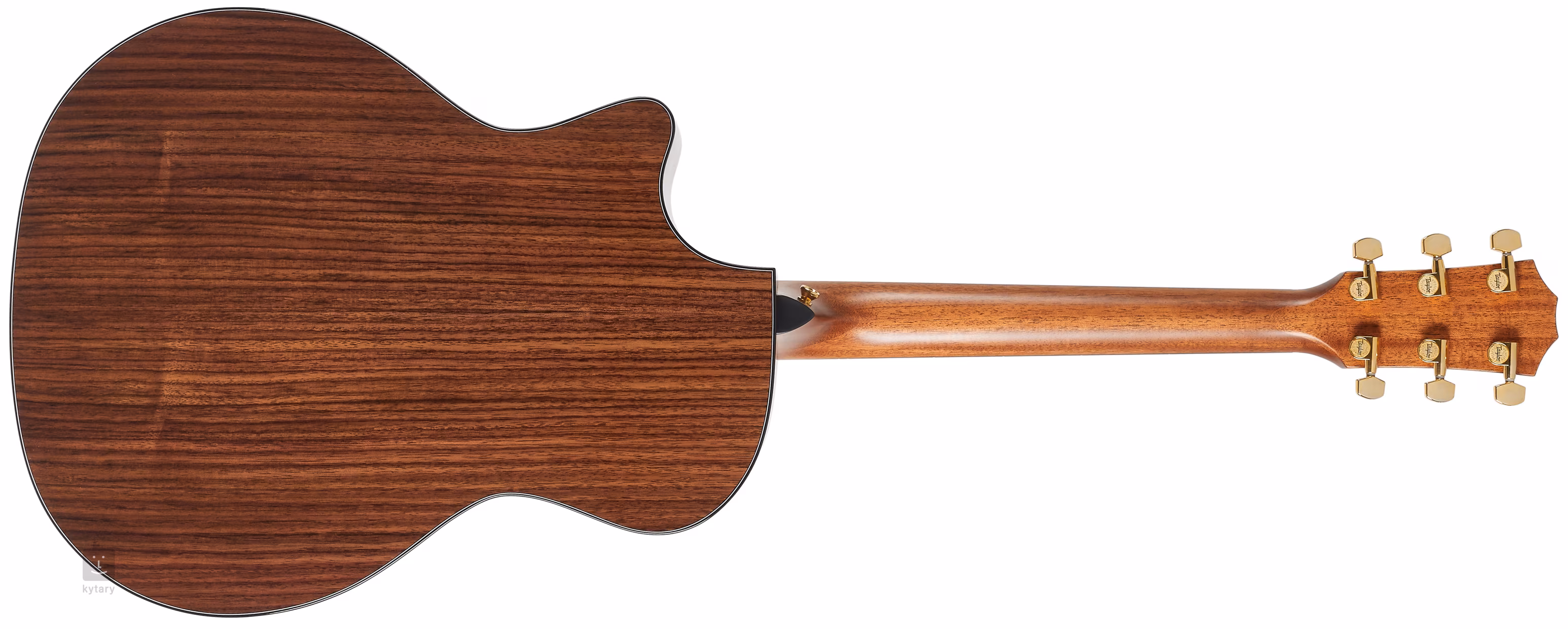 Die Saiten sind in der firmeneigenen goldlackierten Mechanik und in einem Ebenholzgriffbrett in moderner Taylor-Form montiert. Die schöne Verarbeitung wird durch das schwarze Perimeter-Binding, die grüne Abalone-Rosette, die Ebenholz-Wirbel für die Kopfplatte mit Perlmutt-Punkten (Abalone) und das Schlagbrett aus Schildpatt-Imitat noch unterstrichen.