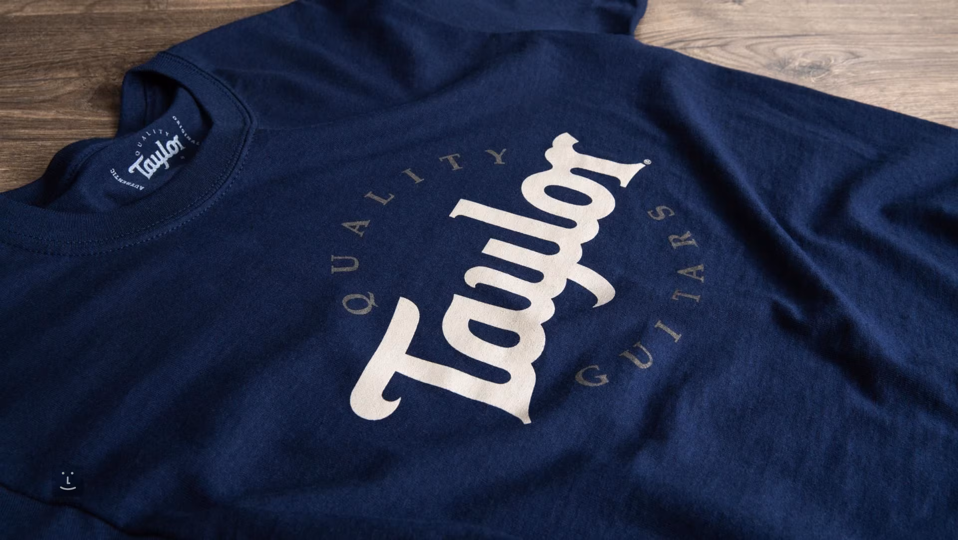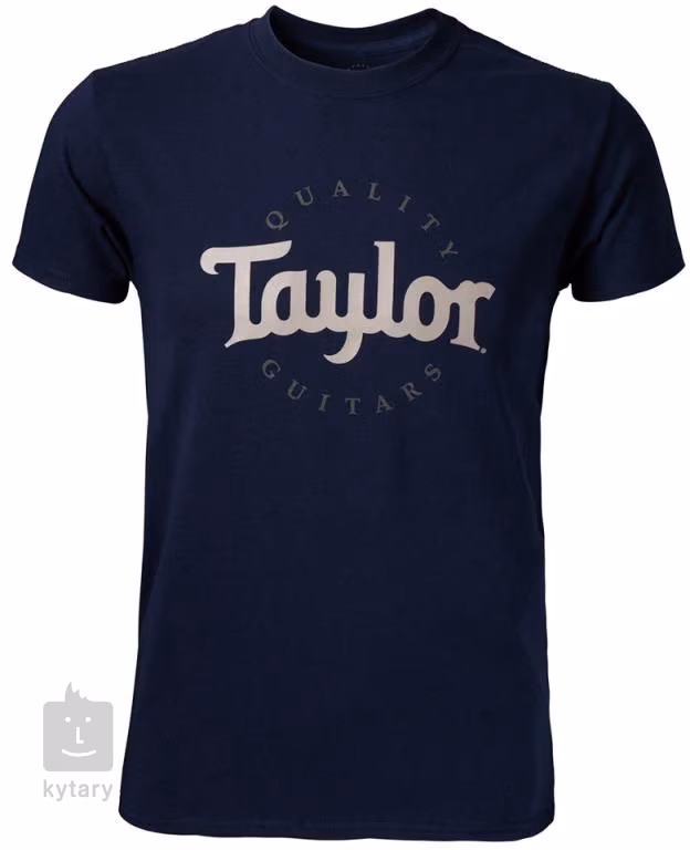 Men's Classic T Marineblaues Baumwoll-T-Shirt mit dem Logo des amerikanischen Gitarrenherstellers Taylor. Das T-Shirt ist in mehreren Größen erhältlich.