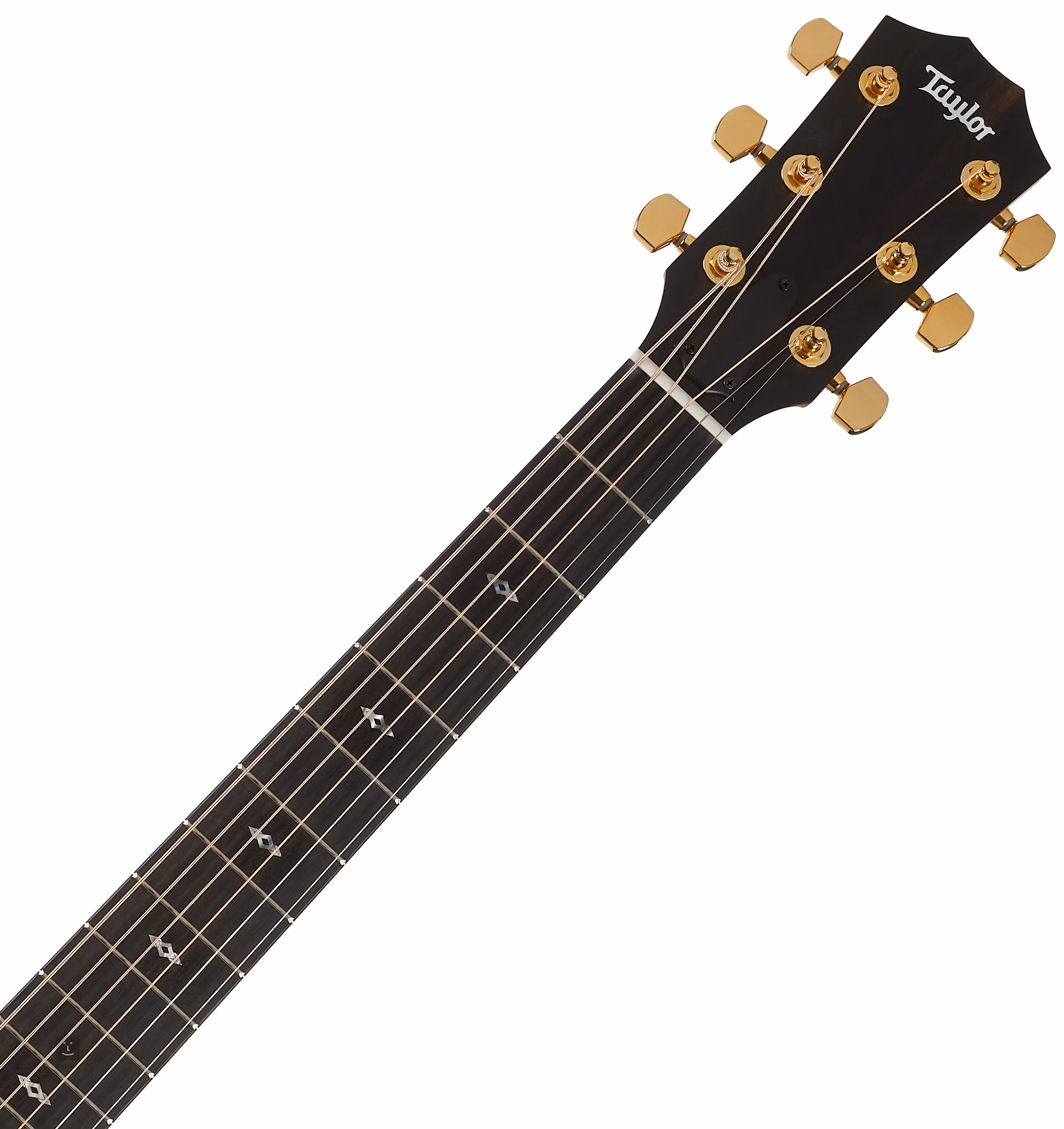 Die Stimmstabilität wird durch die NuBone-Nullbund-Saitenbefestigung in der Ebenholzkopfplatte und die Taylor-Goldlackierung gewährleistet. Der stilvolle Look des Instruments wird durch das goldene Sunset Edgeburst-Finish der Decke, das schwarze Body Binding, die dekorativen Positionsmarker aus Perlmuttimitat und das Schlagbrett aus Schildpattimitat unterstrichen.