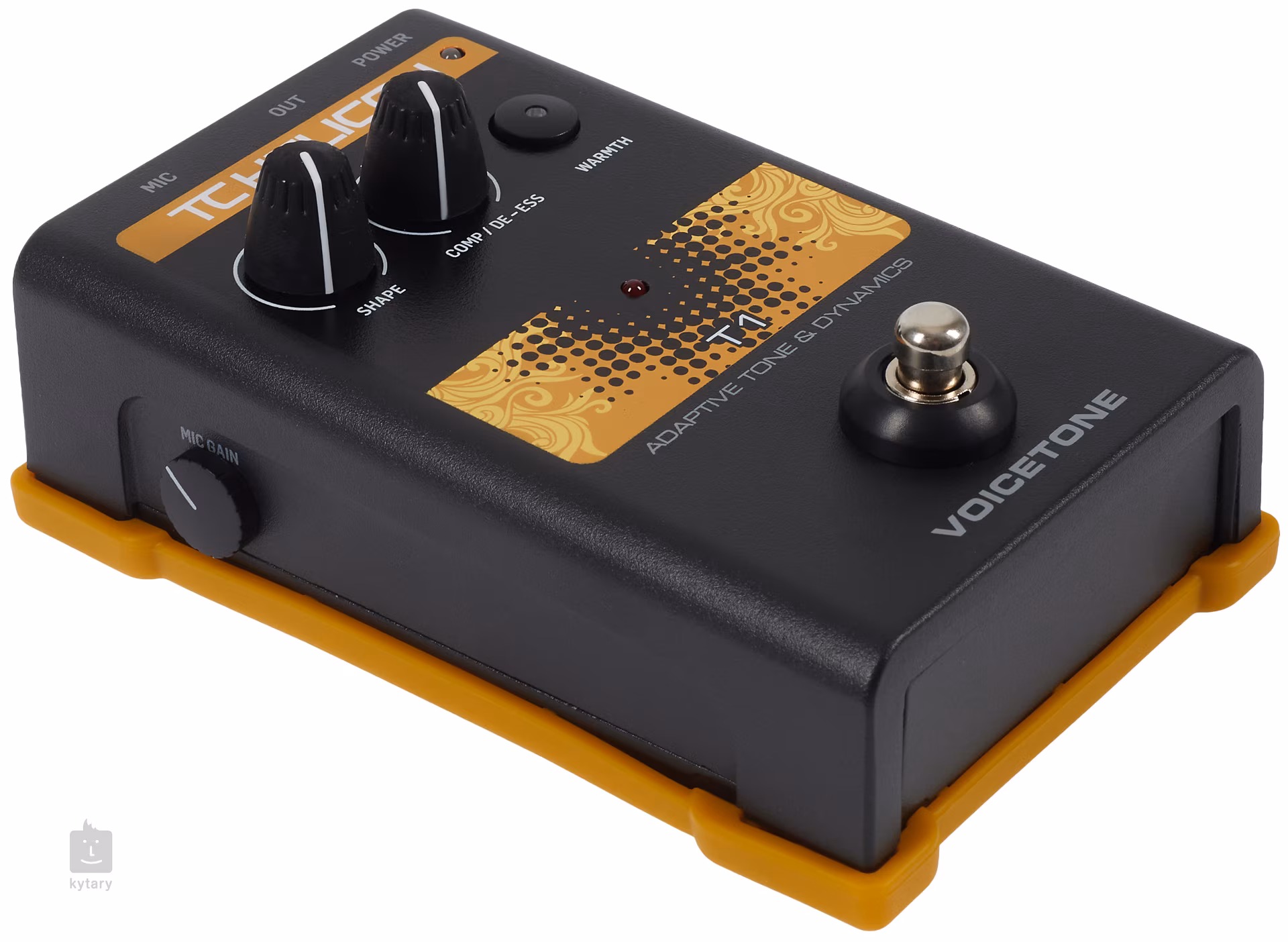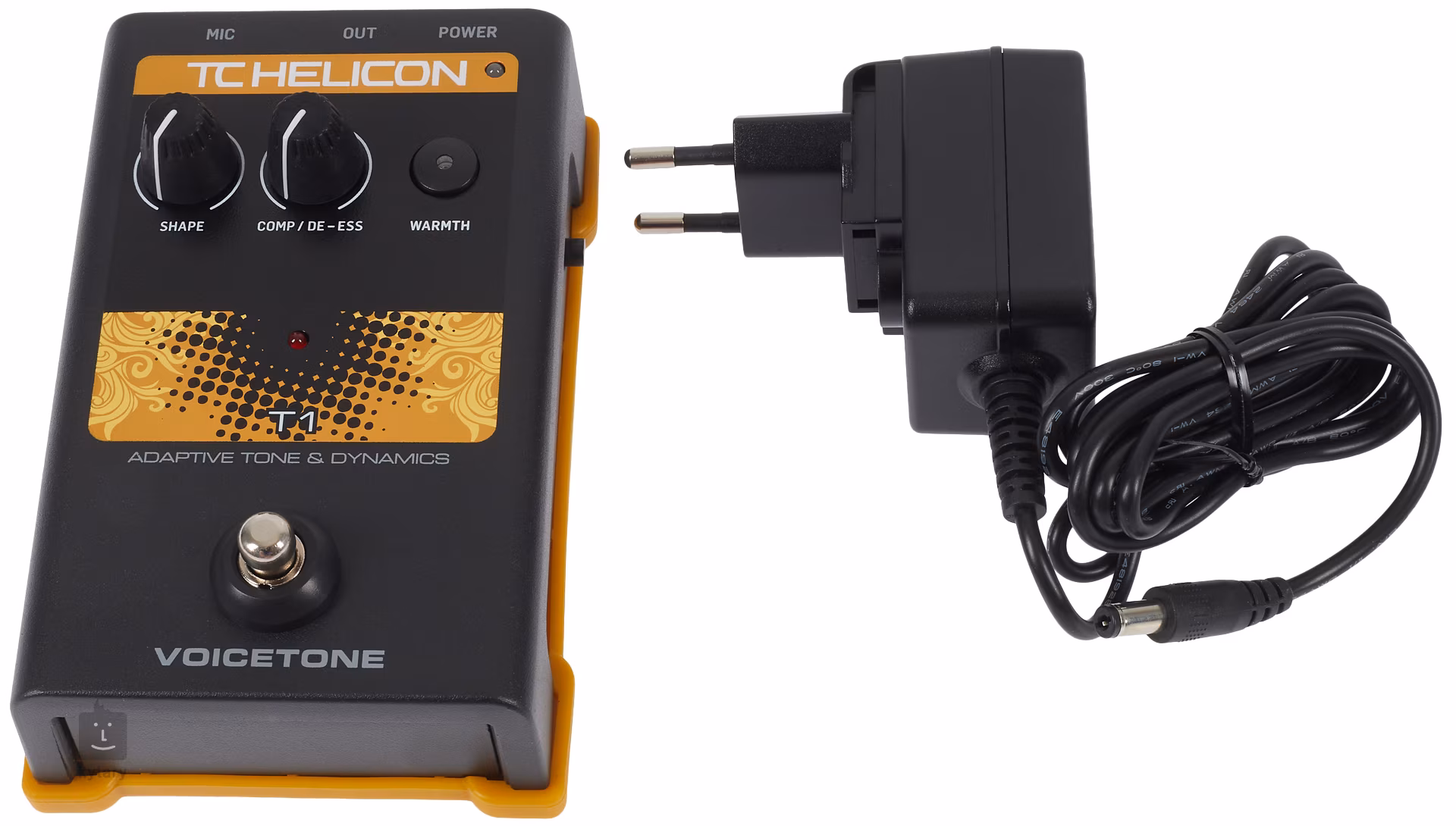 Die Modellreihe TC HELICON VOICETONE SINGLE umfasst einfache Stompboxen für Sänger, die jeweils klar definierte Funktionen und vor allem eine einfache und schnelle Bedienung bieten. So kann jeder nur die wesentlichen Effekte auswählen, die er für seinen Gesang unbedingt benötigt, anstatt eine teurere Investition in einen der Multieffekte zu tätigen, denen die Voicetone Single klanglich problemlos ebenbürtig sind. VOICETONE T1 dient als Werkzeug zur Bearbeitung der Klangfarbe und zur Einstellung der Dynamik. Der Effektkreis umfasst einen Multiband-Equalizer, einen Kompressor und einen De-Esser. Alle Modelle der VOICETONE-Serie verfügen über einen leisen und klanglich sauberen Mikrofonvorverstärker und sehr hochwertige AD/DA-Wandler mit der gleichen Elektronik wie das Flaggschiff TC Helicon VoiceLive 2. Das robuste Metallgehäuse ist praktisch unzerstörbar. Die Bedienung ist sehr einfach: Mit den Potentiometern Shape und Comp / De-Ess stellen Sie den Charakter ein, der am besten zu Ihrer Stimme passt. Mit Shape beseitigen Sie Unklarheiten in den unteren Frequenzen und verleihen Ihrer Stimme mehr Brillanz, während das zweite Potentiometer Ihre Leidenschaft etwas zügelt und glättet. Die Taste Warmth sorgt dann für eine besonders warme Klangfarbe. Der Effekt kann direkt über kompatible Mikrofone wie das TC Helicon MP-75 oder das Sennheiser e835 FX mit Mic Control-Funktion gesteuert werden. Dank der USB-Schnittstelle und der VoiceSupport-App kann der Effekt auf die neueste Firmware aktualisiert werden. Im Lieferumfang sind ein Netzteil und ein USB-Kabel enthalten.