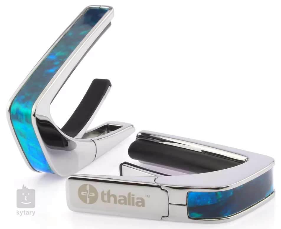 Dieses Modell stammt aus der Exotic Shell Series, bei der verschiedene Arten von exotischem Perlmutt verwendet werden, um ein einzigartiges Design zu erzielen. In diesem Fall ist der Metallkörper des Kapodasters (in Schwarz, Chrom oder Gold) mit eleganten türkisfarbenen Perlmutt-Verzierungen versehen. Ein absolut einzigartiger Kapodaster, der auf jeder Gitarre hervorsticht.
