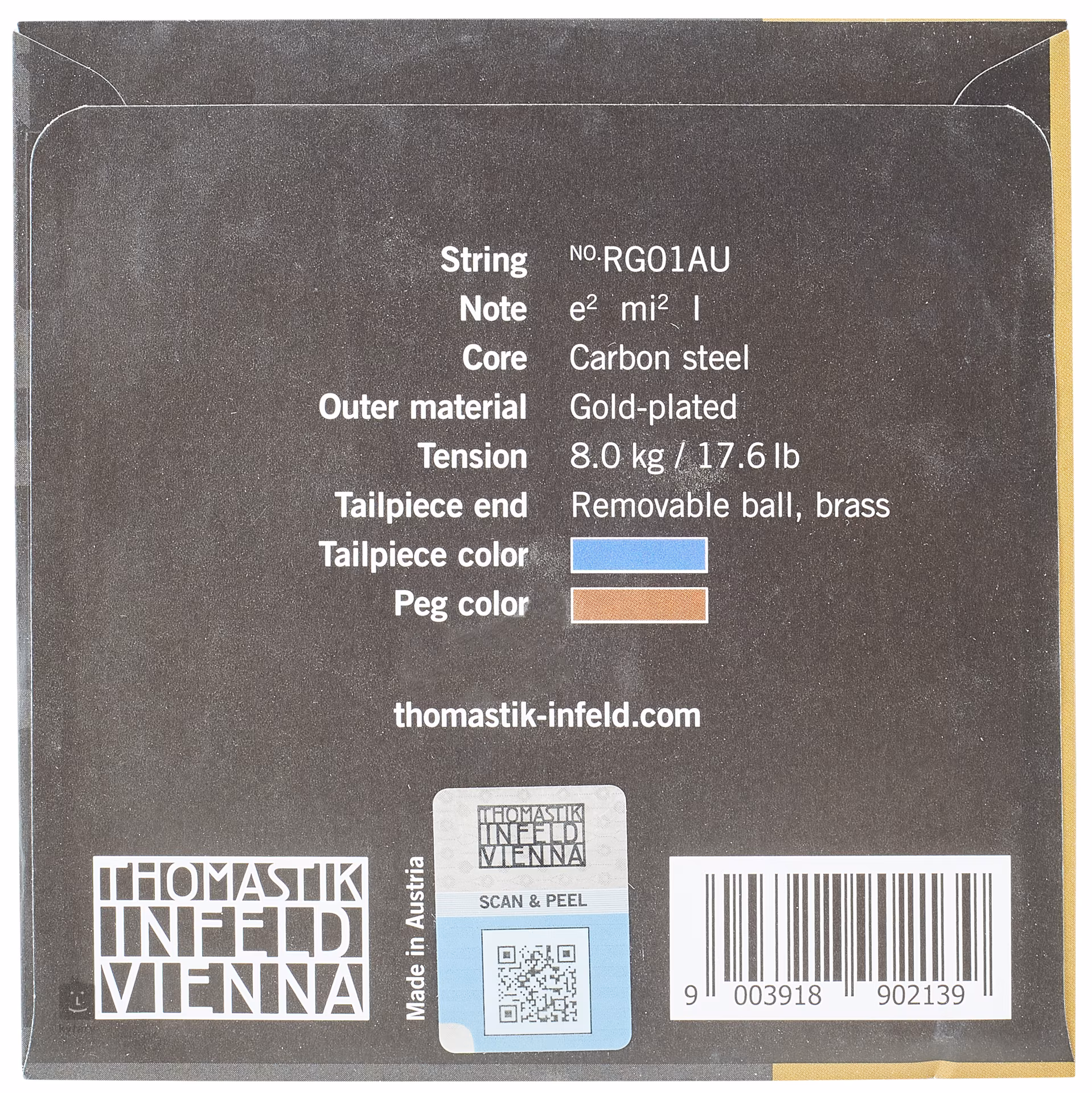 Eine E-Saite aus der Rondo Gold Serie von Thomastik, die sich durch stabile Stimmung und einen hellen warmen Ton auszeichnet. Die Wicklung ist aus Gold gefertigt.