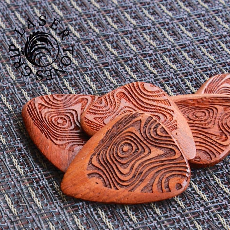 Die beiden Hartholz-Plektren - Bloodwood und Makassar Ebony - erzeugen einen durchdringenden und hellen Klang, der sich besonders für E-Gitarren eignet. Die beiden anderen Plektren sind aus weicheren Hölzern - Almondwood und Thai Sindora - und haben einen warmen und runden Klang, ideal für akustische Gitarren. Die Plektren sind 2,5 mm dick und verjüngen sich zur Spitze hin auf 0,7 mm. Das lasergeschnittene Motiv verleiht ihnen nicht nur ein stilvolles Design, sondern auch einen festen, rutschfesten Griff.