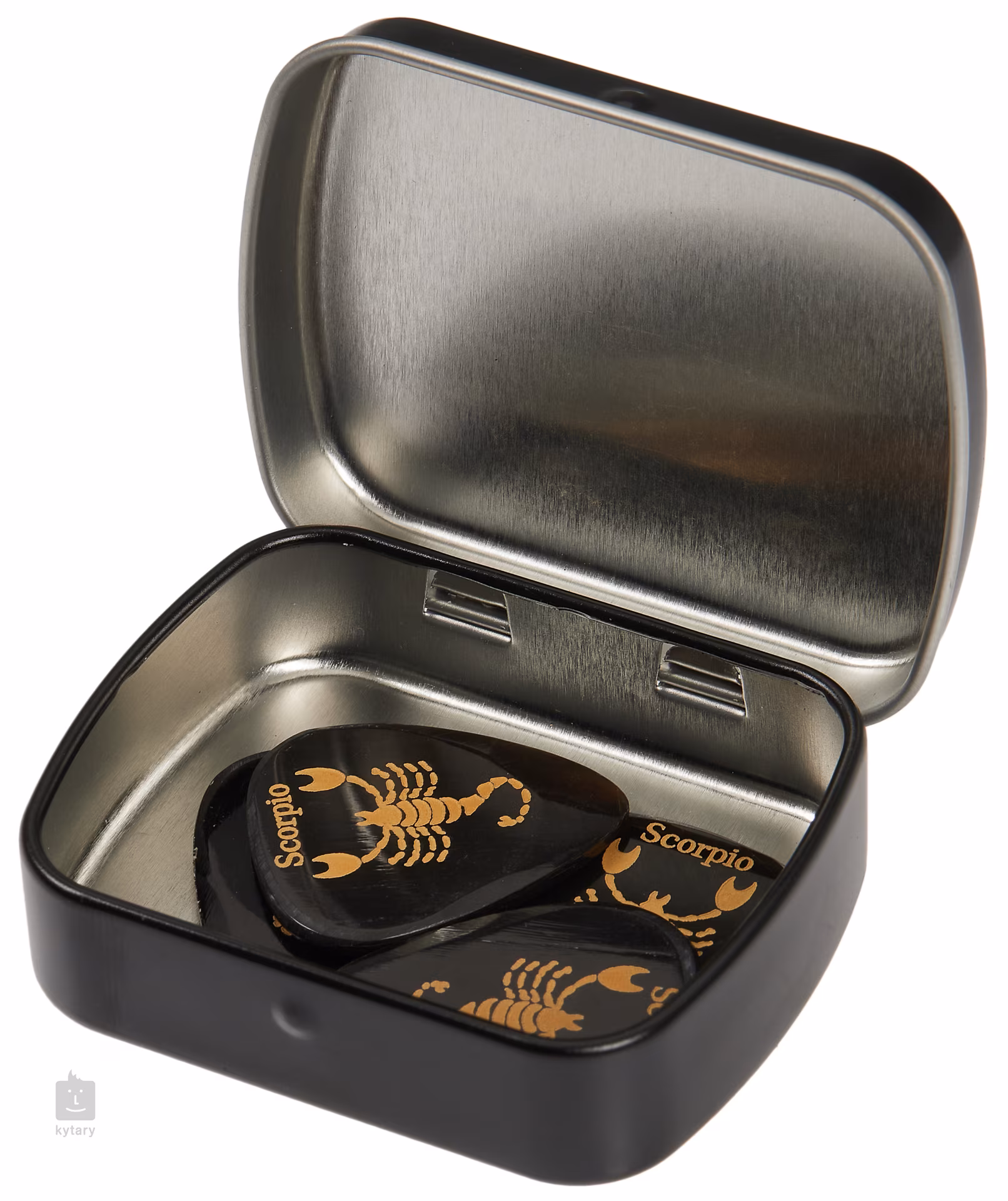Set mit vier Skorpion-Plektren in einer praktischen Blechdose.