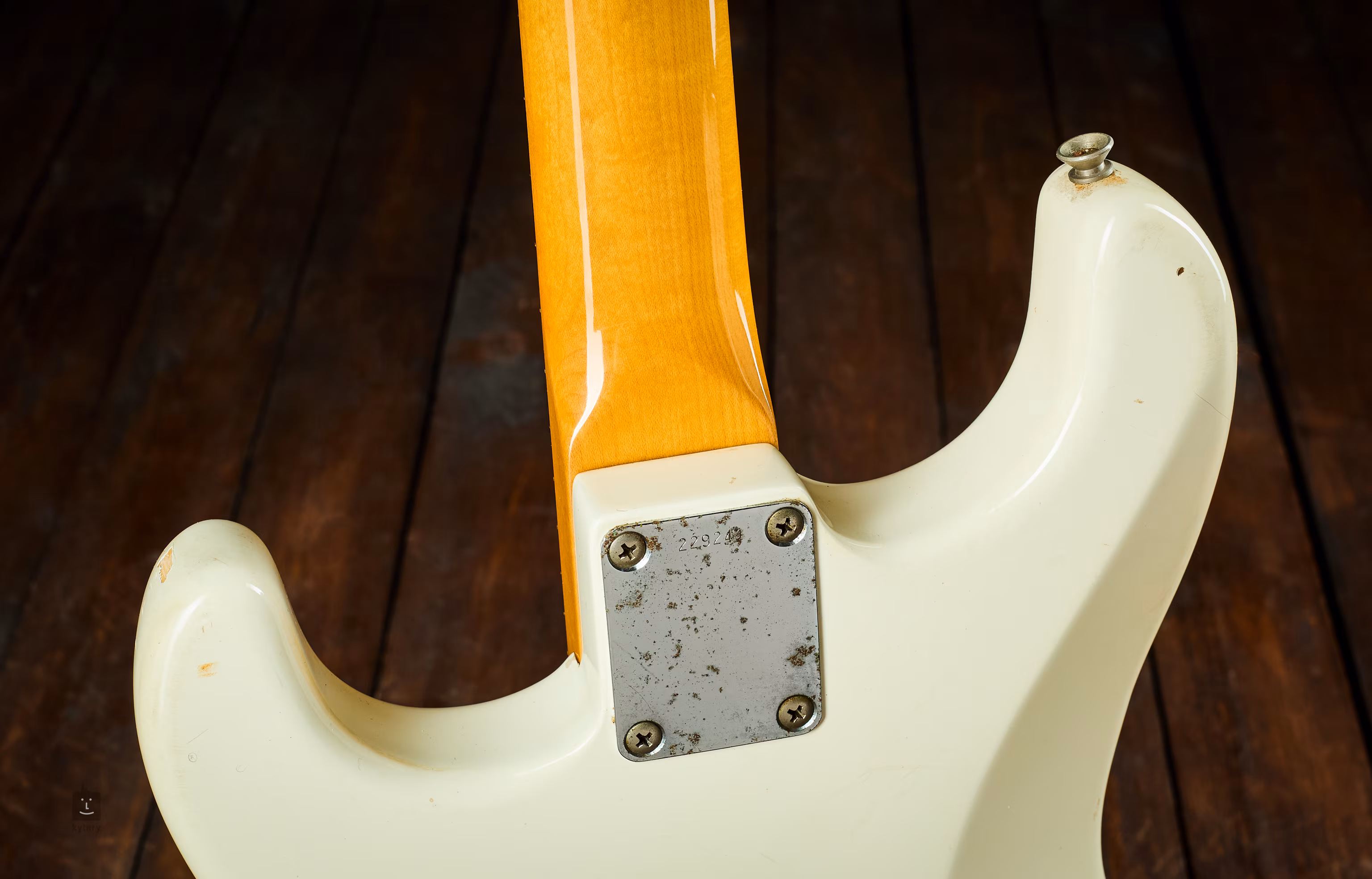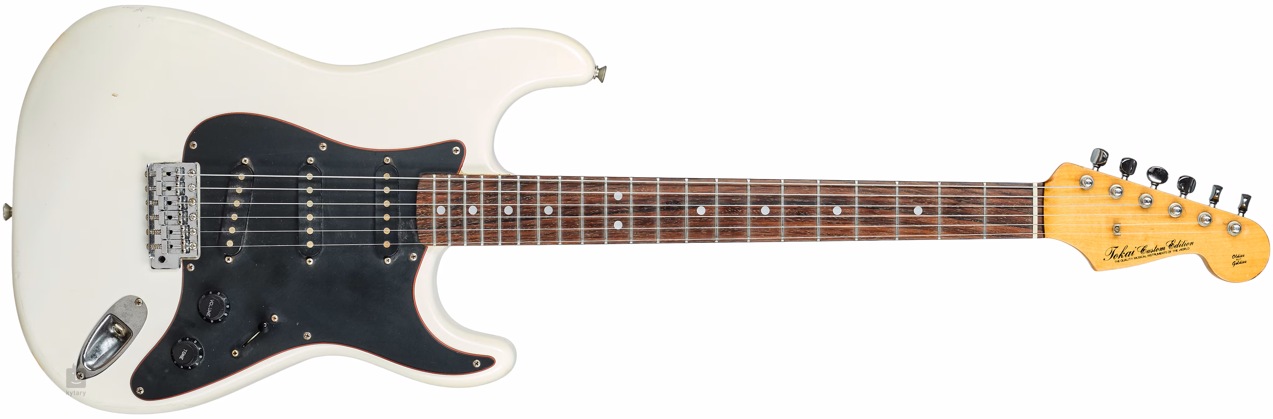 Lawsuit Stratocaster japanischer Herstellung der Marke Tokai, 80er Jahre. Sonderausführung mit nur zwei Reglern – Lautstärke und Tonregler – genau wie es in den 80er Jahren Mode war, als die Steuerung der E-Gitarre weitgehend vom Korpus des Instruments auf den Boden zwischen Pedale und Effekte verlagert wurde.