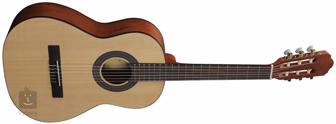 Die Toledo Estudio ST34AS ist eine erschwingliche Kinder-Klassikgitarre in 3/4-Größe, die für Anfänger geeignet ist. Sie verfügt über eine Resonanzdecke aus laminierter Fichte, Boden und Zargen aus laminiertem Mahagoni, einen Okoumé-Hals und ein Griffbrett aus Palisander. Die Saiten sind in klassischen offenen Mechaniken mit Wirbeln aus Perlmuttimitat gelagert. Das stilvolle Finish wird durch die schwarze Randeinfassung mit schwarzen und weißen Linien, die dekorative Rosette und die satinierte Lackierung (offenporig satiniert, natur) betont.