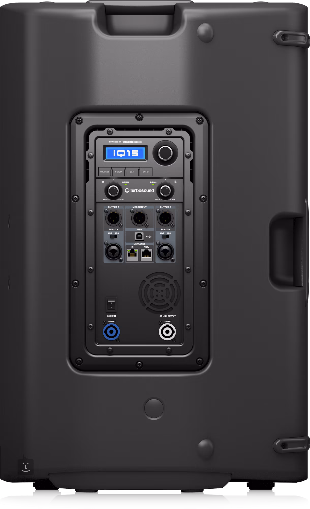 Turbosound iQ15 Zwei-Wege-Aktivlautsprecher mit 2500 Watt Maximalleistung aus einem Klark Teknik Class D-Verstärker, Klark Teknik Digitalprozessor, Frequenzbereich 42 Hz - 20 kHz (-10 dB), maximaler Schalldruck von 132 dB, zwei kombinierte Klinken-/XLR-Eingänge, XLR-Ausgänge der Kanäle A und B, XLR-Mix-Ausgang, Ultranet-Anschlüsse (2x RJ45) für den Anschluss an Konsolen und digitale Mischpulte mit Ultranet-Konnektivität und USB-Anschluss (Fernsteuerung vom PC, Firmware-Update). Der Lautsprecher kann auf handelsübliche Lautsprecherständer montiert werden und kann auch als Bühnenmonitor verwendet werden.