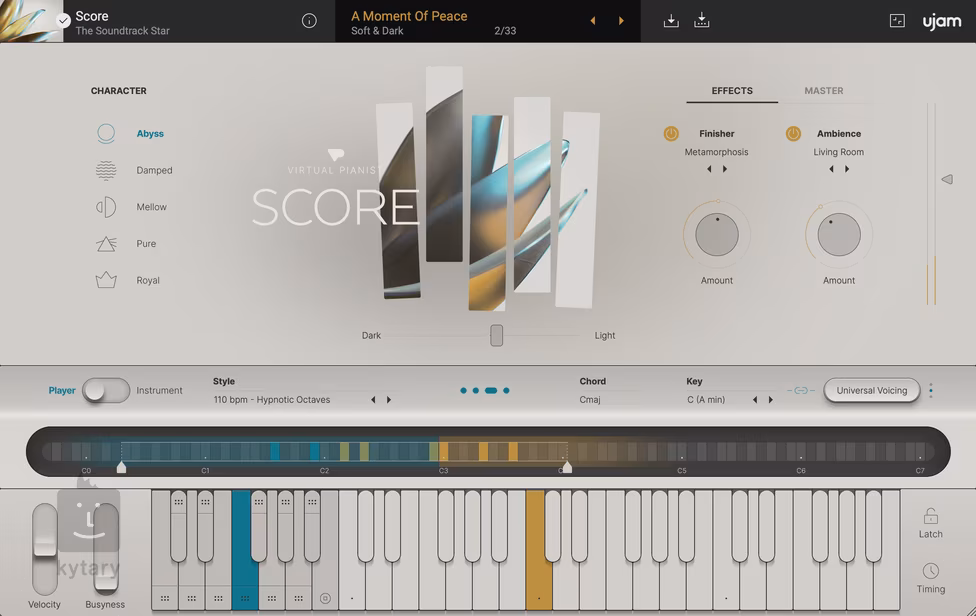 Mit SCORE können Sie den Klang von weich und ausdrucksstark bis hin zu hell und durchsetzungsfähig einstellen, was es ideal für die Erstellung von Filmsoundtracks macht. Sie können im Instrumenten-Modus frei spielen oder SCORE im Player-Modus für Sie spielen lassen.
