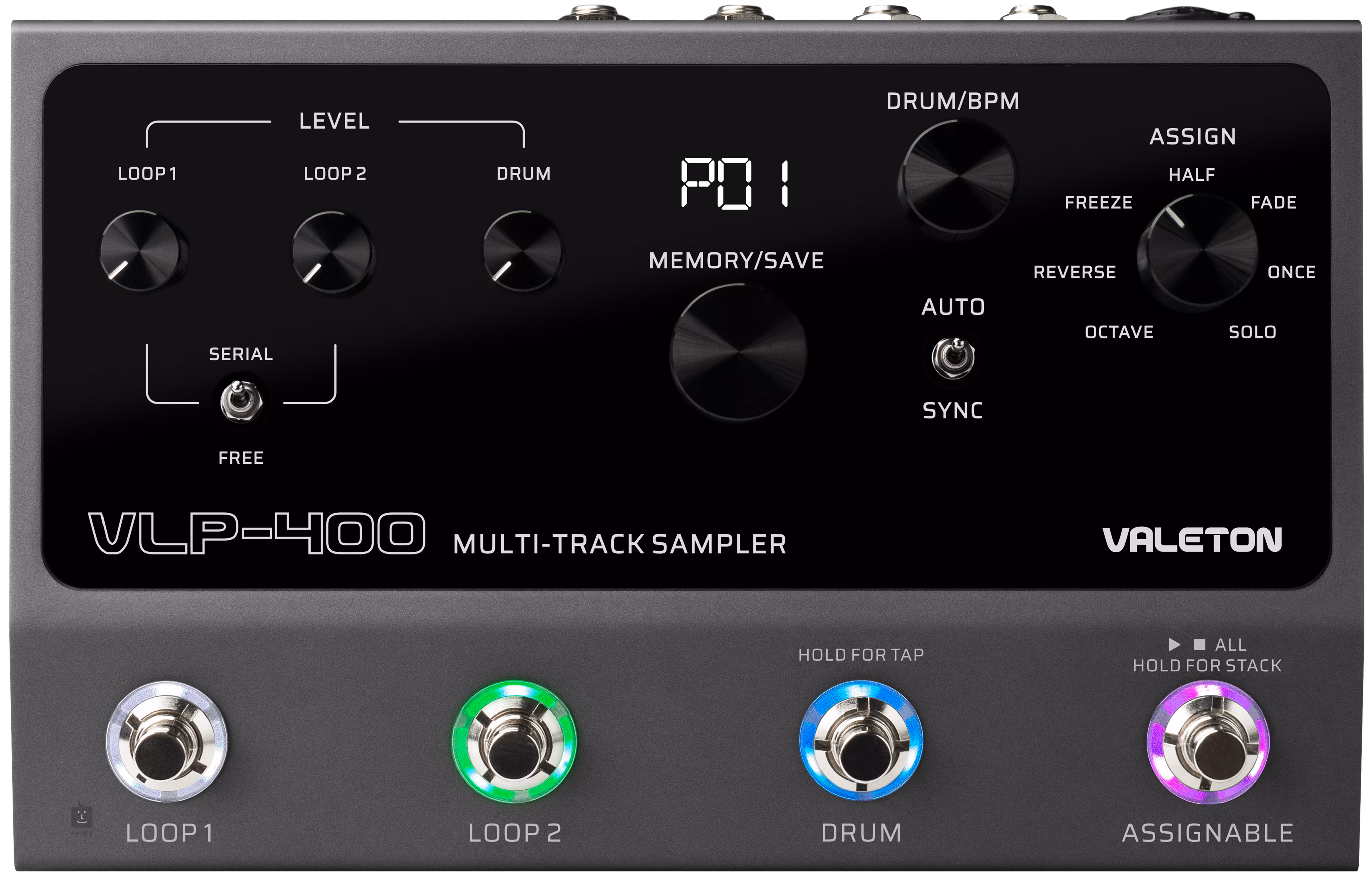 Der Valeton VLP-400 ist ein Zweikanal-Looper, der auf dem Vorgängermodell VLP-200 basiert und neue Looping-Funktionen (Octave, Reverse, Freeze, Half, Fade, Once und Solo), eine höhere Qualität des 32-Bit-Sounds und eine einfachere Steuerung mit vier Fußschaltern mit zuweisbaren Funktionen bietet.