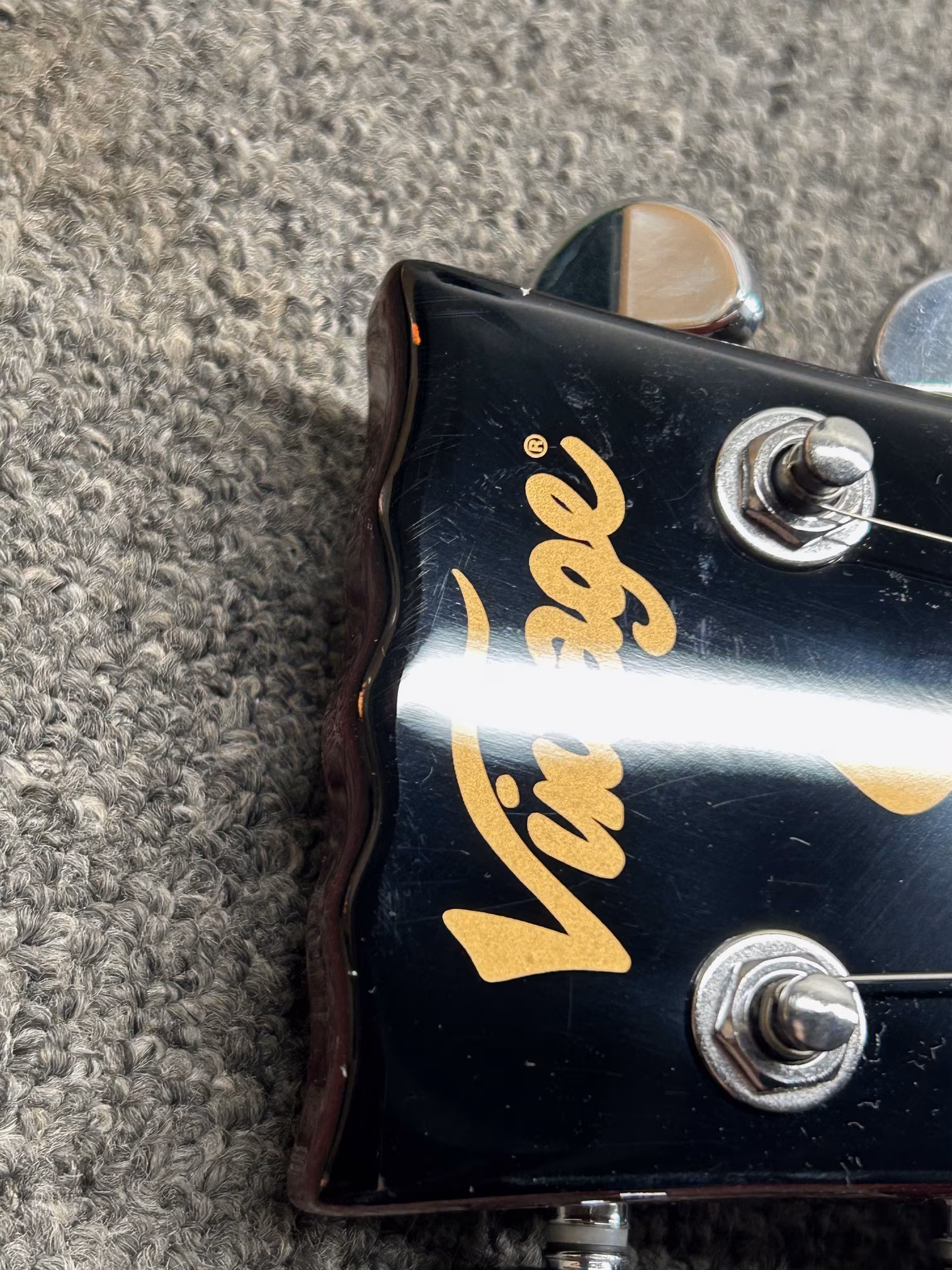 Die Vintage V1003CSB ist eine stylische E-Gitarre im LP-Single-Cut-Design aus der Vintage Reissued Series. Ähnlich wie einige Custom/Supreme-Modelle der berühmten amerikanischen Marke ist sie mit drei Humbuckern ausgestattet, denn wie ein schwedischer Klassiker sagt: „More is more“. Der Mahagonikorpus der Gitarre ist mit einer geschnitzten Decke aus massivem Ahorn und einer Lackierung in Cherry Sunburst versehen. Der Mahagonihals mit einem angenehmen „Soft C”-Profil ist mit einem Palisandergriffbrett mit 22 Medium-Jumbo-Bünden versehen. Drei Humbucker der Marke Wilkinson verleihen der Gitarre einen richtig saftigen Sound, der sowohl aggressiv rockig als auch warm bluesig sein kann und gleichzeitig eine ungewöhnlich breite Klangpalette bietet. Mit separaten Lautstärkereglern können Sie die Lautstärke der einzelnen Tonabnehmer herunterdrehen, d. h. in der mittleren Position, in der alle drei Humbucker aktiv sind, können Sie eine beliebige Kombination von Tonabnehmern einstellen. So können Sie die Einstellungen genau an Ihre Bedürfnisse anpassen. Die Saiten sind über den GraphTech Nubone-Nullsattel in zuverlässigen Grover-Stimmmechaniken und im Wilkinson TOM-Steg und Saitenhalter befestigt. Die E-Gitarren von Vintage bieten zu einem sehr attraktiven Preis eine hervorragende Verarbeitung und Eigenschaften, die Sie auch bei viel teureren Modellen finden würden. Sie sind eine ausgezeichnete Wahl für Anfänger, aber dank ihres Klangs und Spielkomforts werden sie auch von fortgeschrittenen Gitarristen geschätzt.