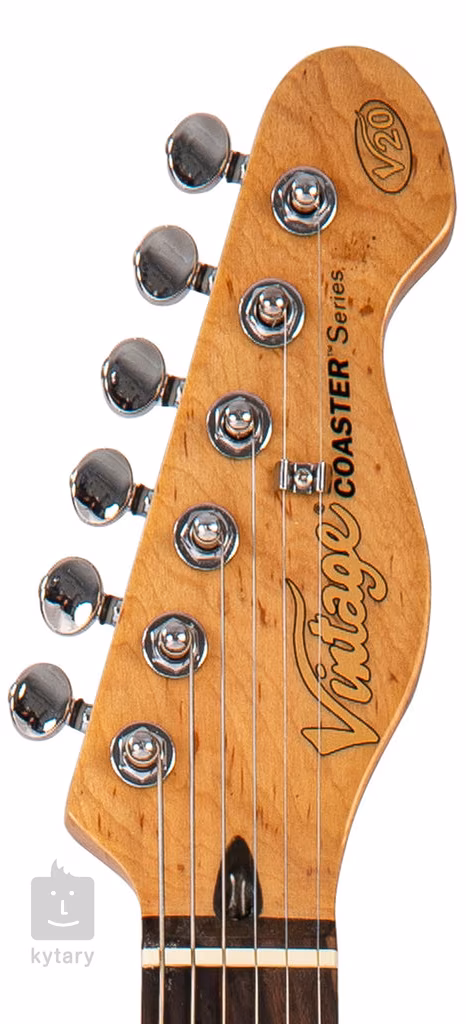 Die Vintage V20 Coaster Series Gloss Black ist eine E-Gitarre im Stil der beliebten T-Modelle. Der Korpus des Instruments ist aus dem Holz des asiatischen Pavlovnia-Baums gefertigt. Ein Palisandergriffbrett mit zweiundzwanzig Bünden ist auf einen verschraubten Ahornhals geklebt.