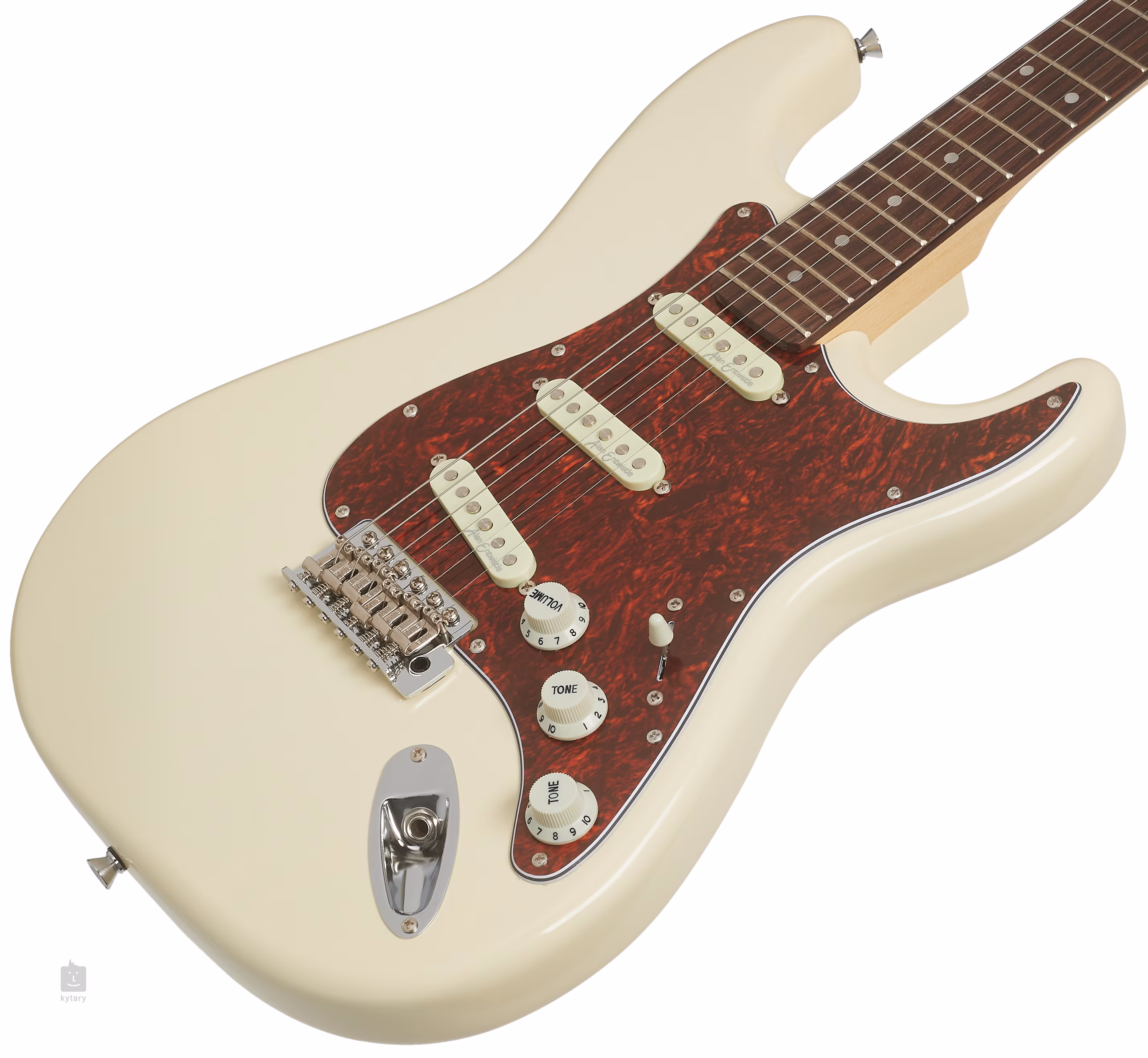 Die Saiten sind durch verchromte Druckgussmechaniken und Vibrato mit verstellbaren Sätteln verankert. Das Styling wird durch traditionelle Elemente in Form eines dreilagigen Pickguards und Positionspunkten auf dem Griffbrett akzentuiert.