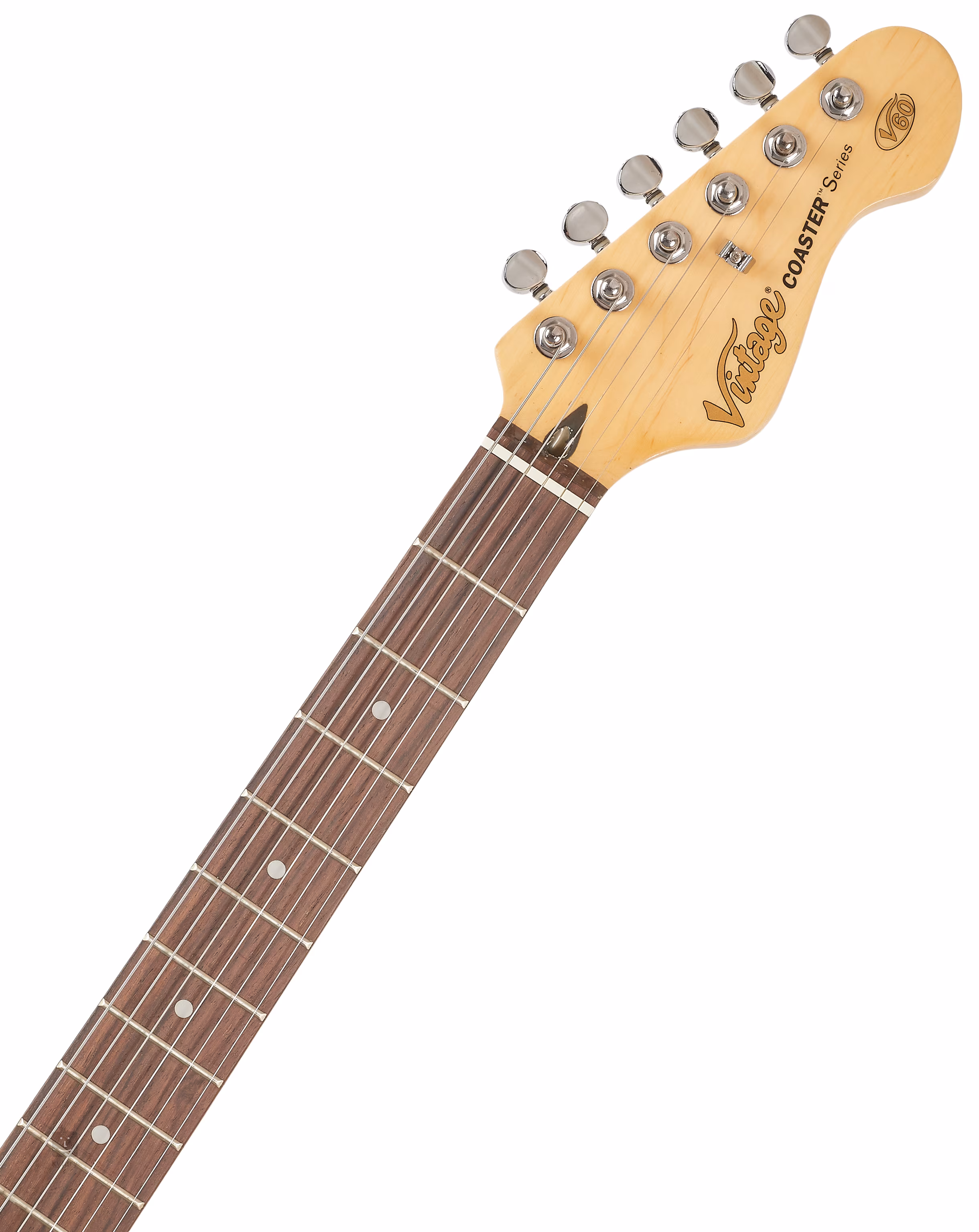 Die Vintage V60 Coaster Series Gloss Red ist eine E-Gitarre in der Double-Cut-Form der ST-Modelle. Der Korpus des Instruments ist aus dem Holz des asiatischen Pavlovnia-Baums gefertigt. Auf den verschraubten Ahornhals ist ein Palisandergriffbrett mit zweiundzwanzig Bünden geklebt.