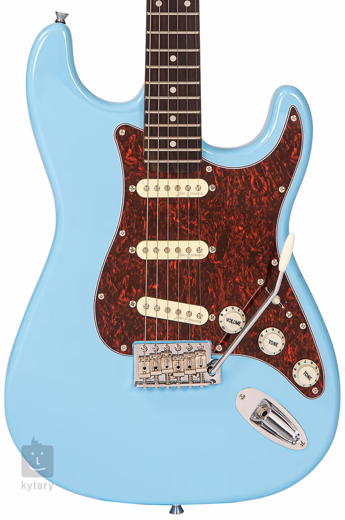 Die Saiten sind durch verchromte Druckgussmechaniken und Vibrato mit verstellbaren Sätteln verankert. Das Styling wird durch traditionelle Elemente in Form eines dreilagigen Pickguards und Positionspunkten auf dem Griffbrett akzentuiert.