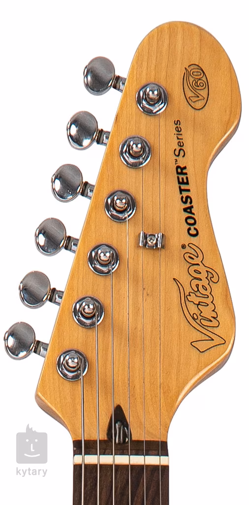 Die Vintage V60 Coaster Series Laguna Blue ist eine E-Gitarre in der Double-Cut-Form der ST-Modelle. Der Korpus des Instruments ist aus dem Holz des asiatischen Pavlovnia-Baums gefertigt. Ein Palisander-Griffbrett mit zweiundzwanzig Bünden ist auf den verschraubten Ahornhals geklebt.